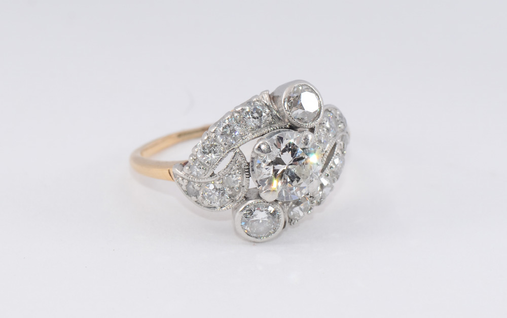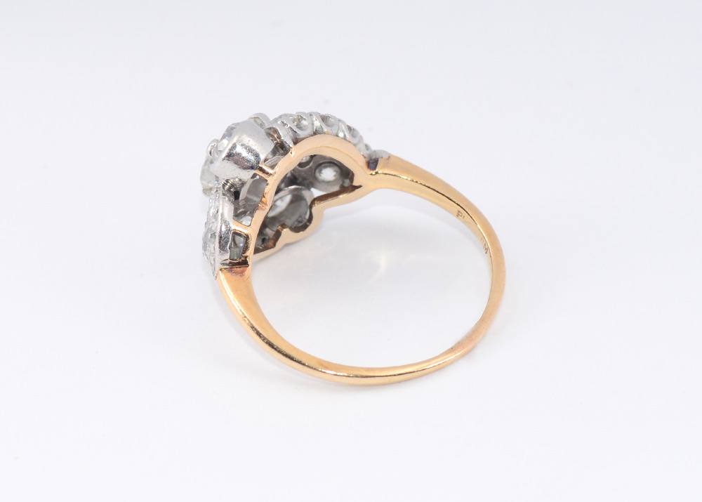 VINTAGE 1930'S DIAMOND RING: Platinum and 14K ring centers 1 transitional brilliant cut diamond. approx. .67 Ct., rated SI2 in clarity and G in color. The diamond is chipped. An additional 16 single cut, full cut diamonds total approx. .90 Ct., rated VS in clarity and G in color. Total diamond weight: 1.57 Ct. Approx. The diamonds are prong and bezel set. Platinum top. Weight: 4.2 grams Size: 6.
