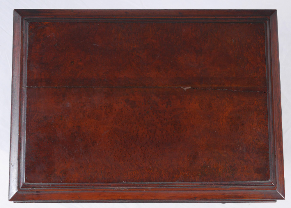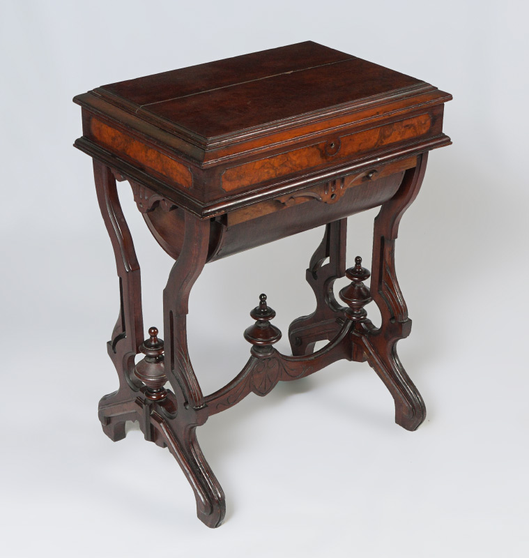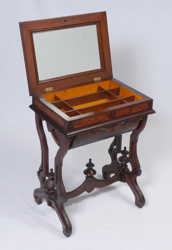 VICTORIAN BURL WALNUT SEWING STAND: Lift top with mirror inside lid, compartmented storage. Lower barrel bottom drawer with carved pull, carved supports and stretchers with spire finials. Overall measures 29'' h. x 21 3/4'' x 15 1/4''.