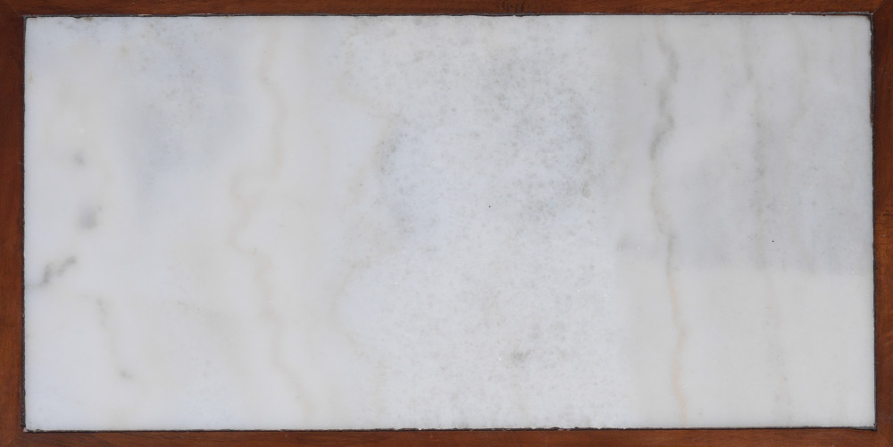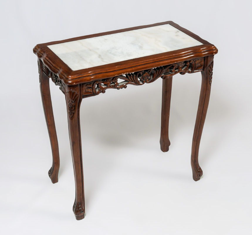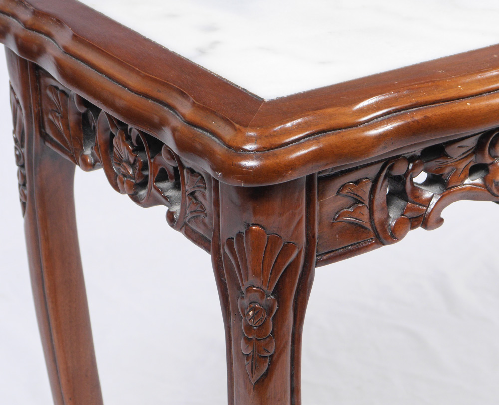INSET MARBLE TOP CARVED SIDE TABLE: Inset white marble top, carved apron, shaped legs with carved decoration at shoulders and feet. Overall measures 25'' h. x 24 3/4'' x 14''.