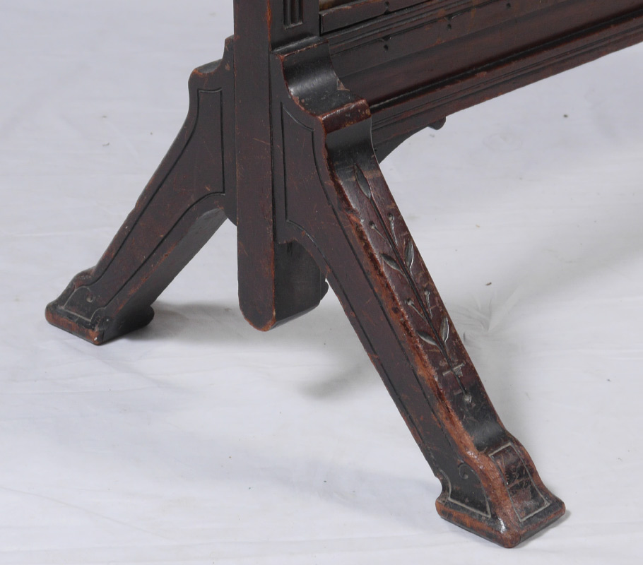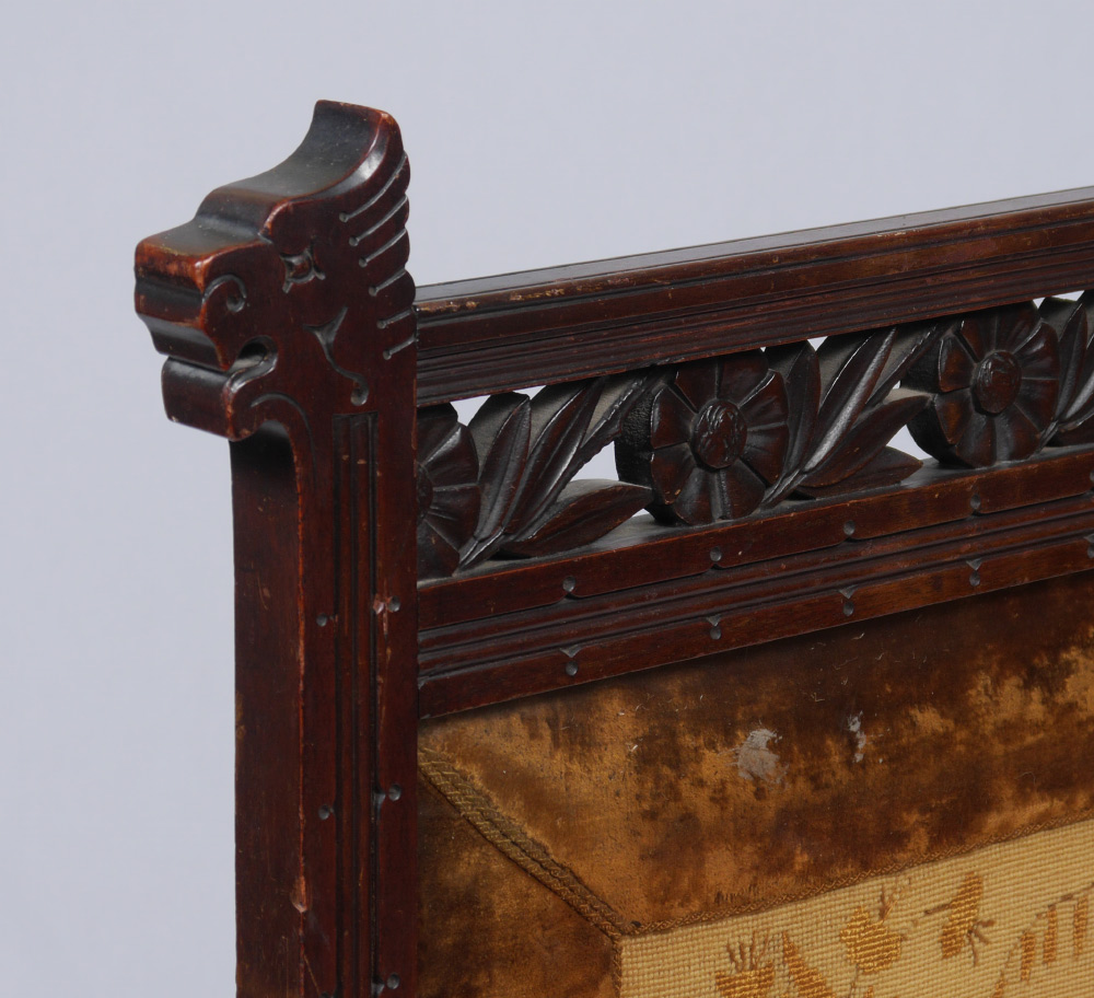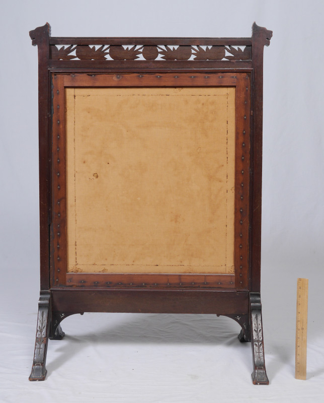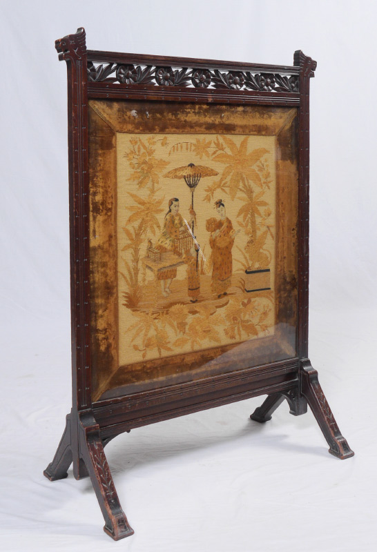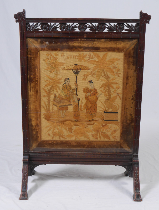 CARVED VICTORIAN ORIENTAL MOTIF FIRE SCREEN: Frame with carved stylized lion head finial, carved and pierced crest with floral motif. Embroidered screen with oriental scene of a bird seller with velvet border, under beveled glass. On carved splayed legs, overall measures 42 3/4'' h. x 28 1/2'' x 14 3/4''.
