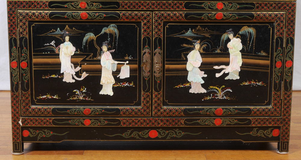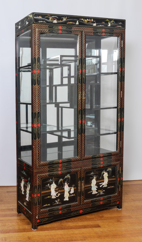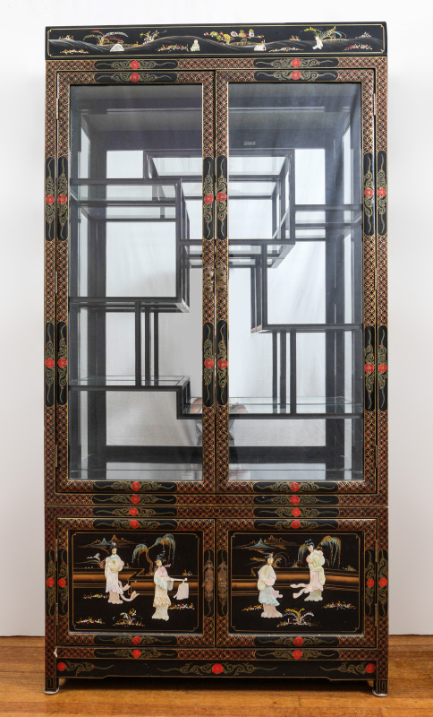 CHINOISERIE ETAGERE DISPLAY CABINET: Paint decorated over lacquer with applied stone figures, 2 glass doors and sides. Mirrored back interior with multi level shelves. Base with 2 blind doors, 78 1/4'' h. x 40'' x 14''. For a pair see next lot 1157.