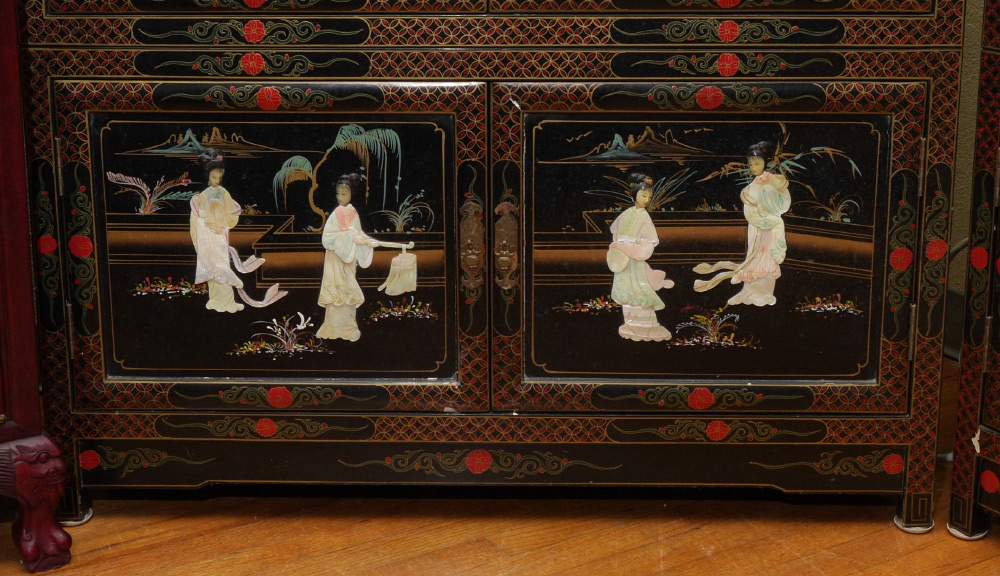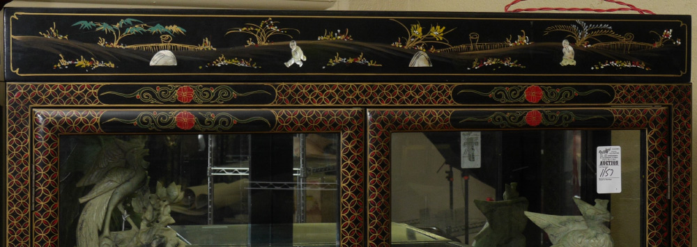 CHINOISERIE ETAGERE DISPLAY CABINET: Paint decorated over lacquer with applied stone figures, 2 glass doors and sides. Mirrored back interior with multi level shelves. Base with 2 blind doors, 78 1/4'' h. x 40'' x 14''. For a pair see next previous lot 1156.