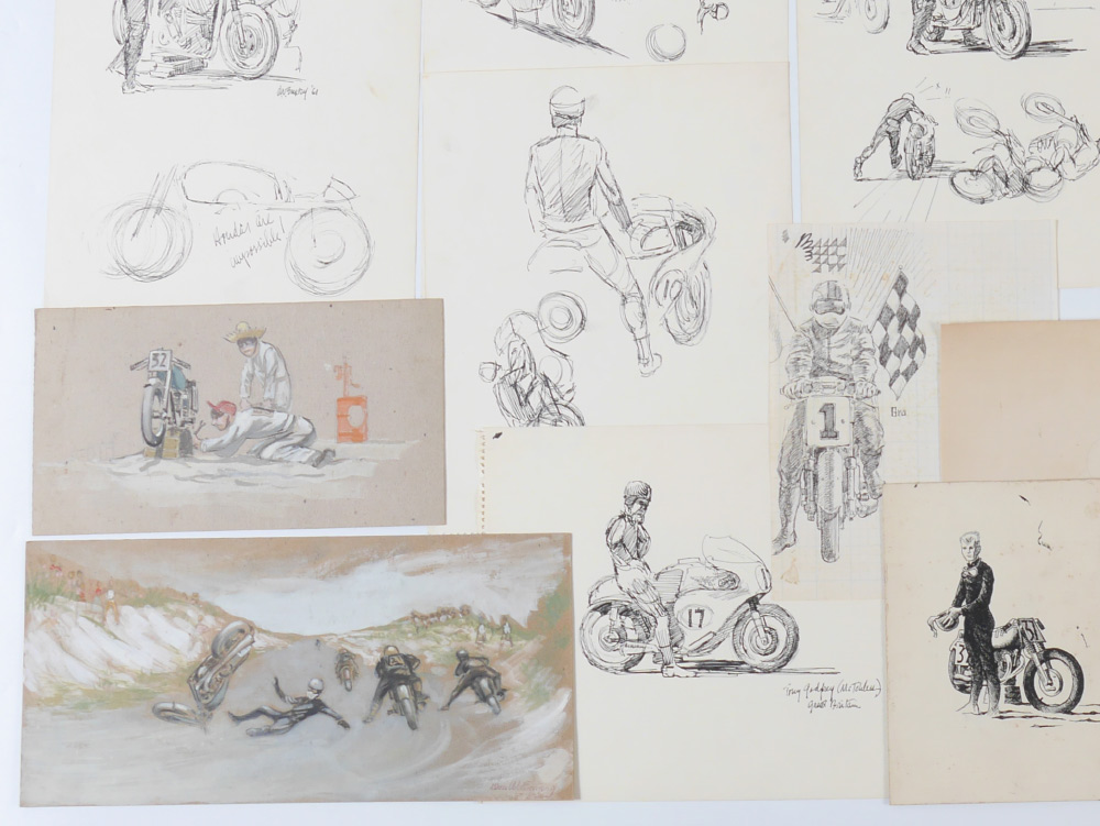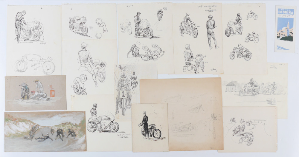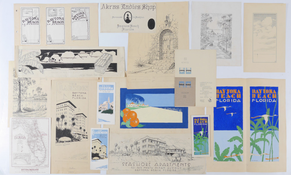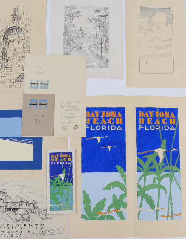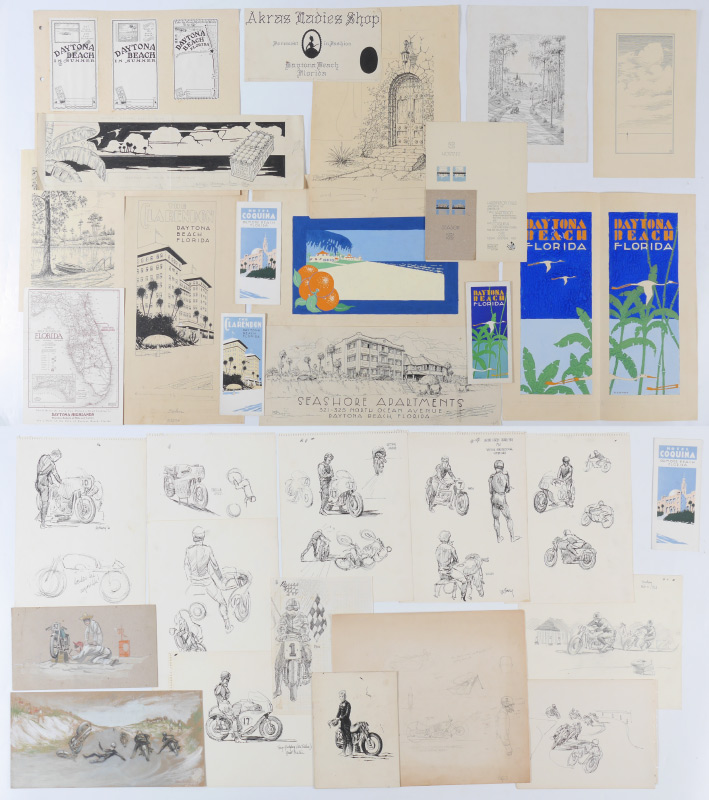 EMERY, Donald J., (American, 20th C): Large Illustration lot. Founder of the Daytona Art League, Local Illustrator, produced artwork promoting the area, as well as local motor sports events. All items are loose and unframed, many pieces signed, but some are not.
