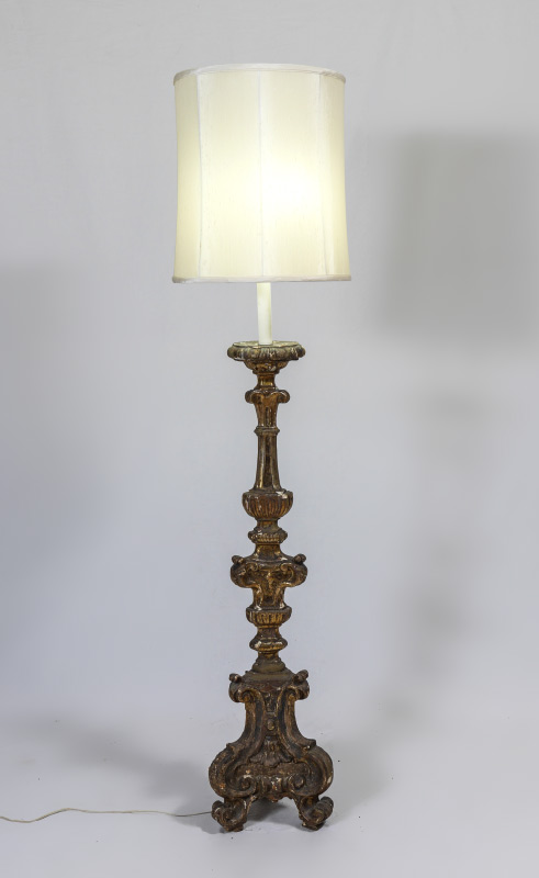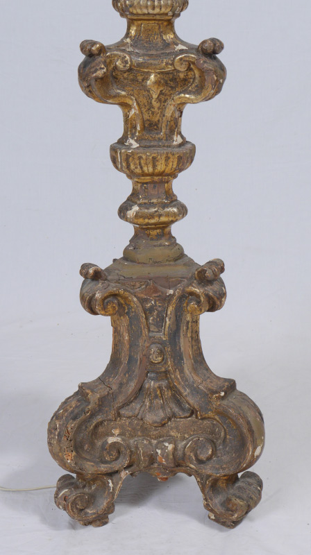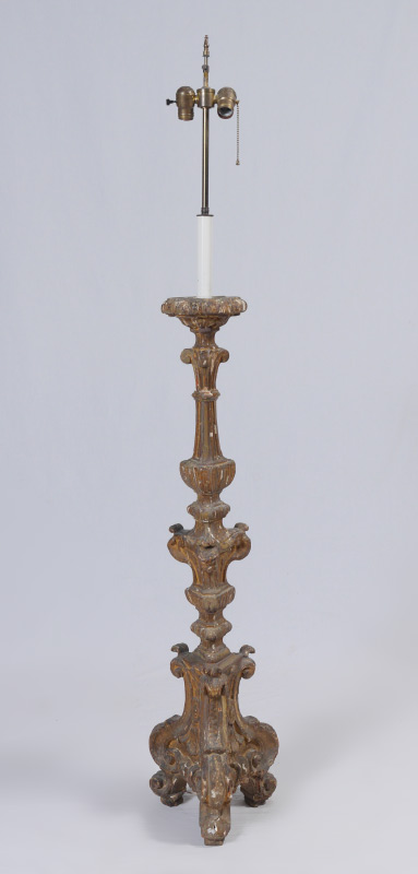 VENETIAN CARVED GILT WOOD CANDLE STAND FLOOR LAMP: Carved gilt wood candle stand in the rococo style base, fitted to accommodate a electric 2 light fixture. Overall measures 63'' h. x 11 1/2''.