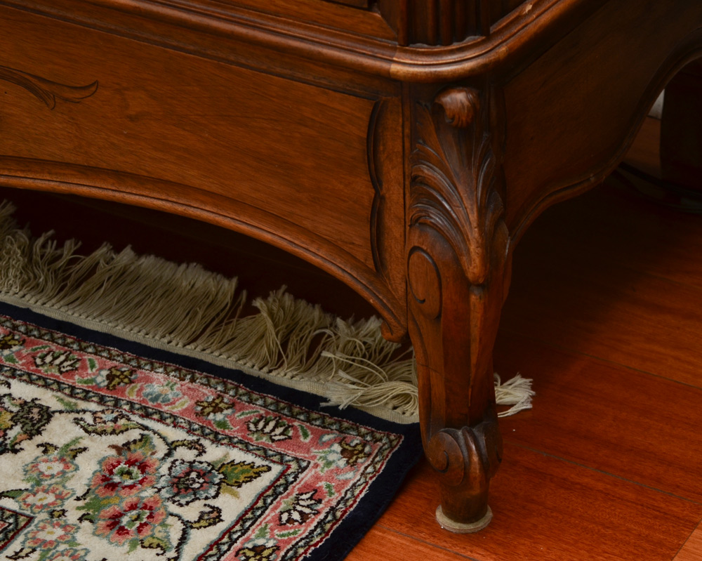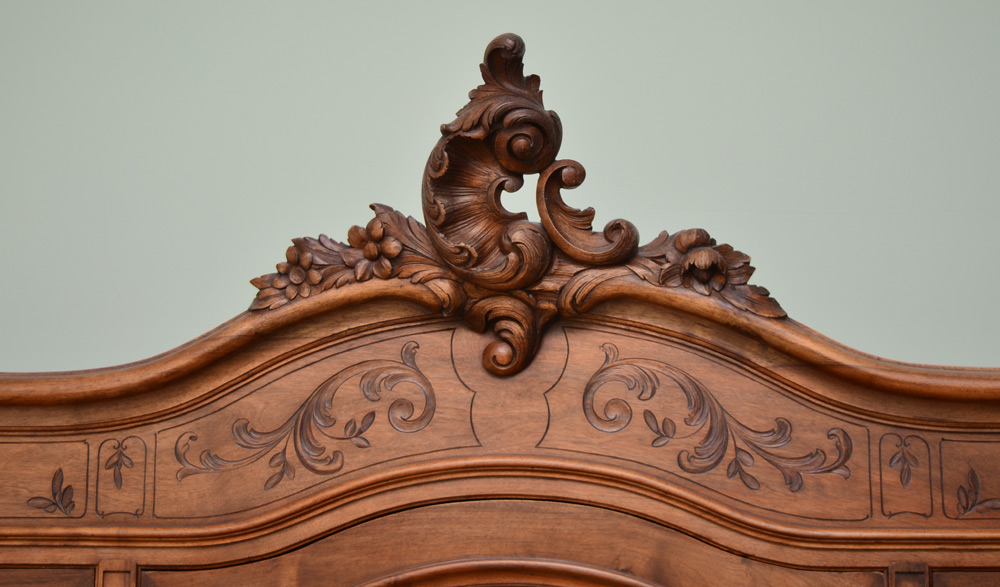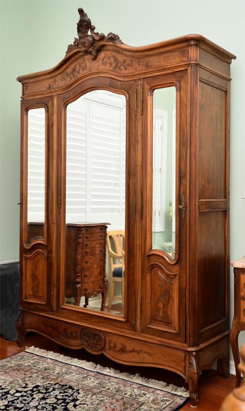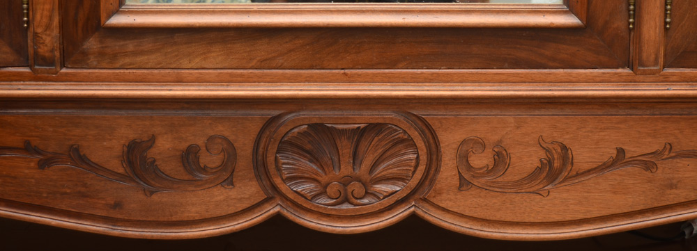 COUNTRY FRENCH ARMOIRE: Foliate scroll crest over arched pediment with carved decoration, 3 beveled glass mirror doors, 3 internal shelves and drawers, carved and shaped skirt and legs. Overall measures 101 1/2'' h. x 68 1/2'' x 21''.