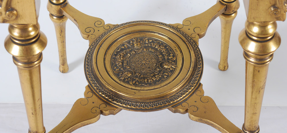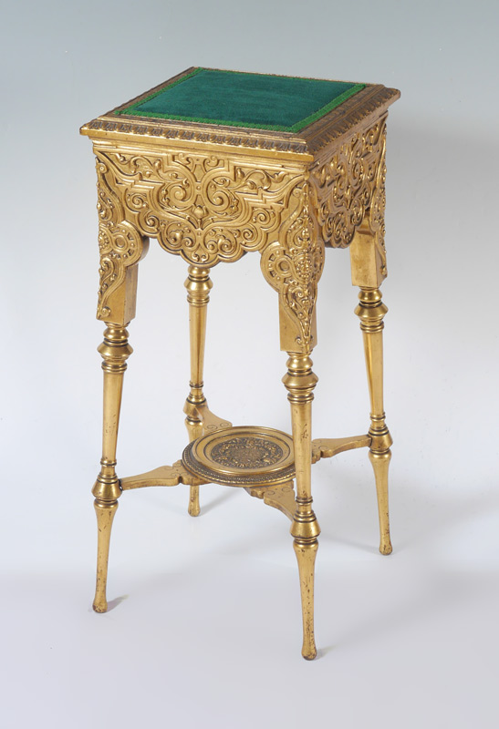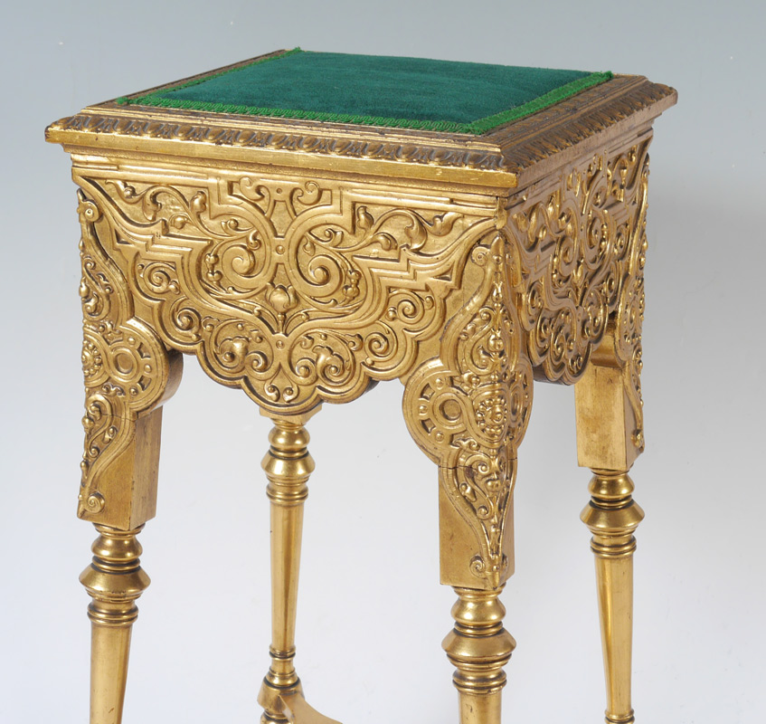 CARVED GILT WOOD PLANT STAND: Top with green upholstered center, carved borders. Profusely carved apron tops of legs, lower open center medallion on stretchers. Turned legs, entire piece with water gilt decoration. Overall measures 35 3/4'' h. x 14'' x 14''