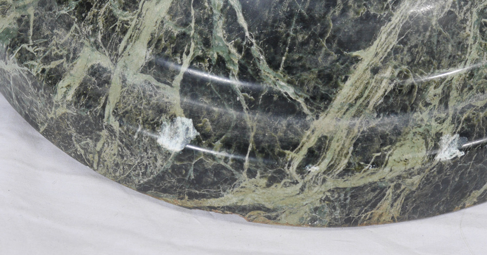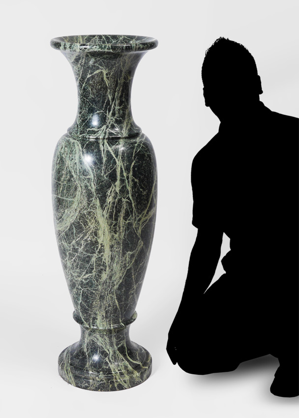 LARGE GREEN MARBLE FLOOR VASE: Baluster form variegated green marble, 39 1/2'' x 12''.