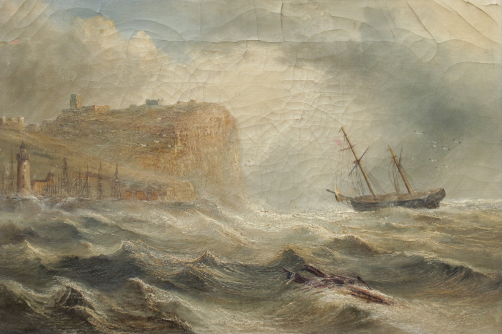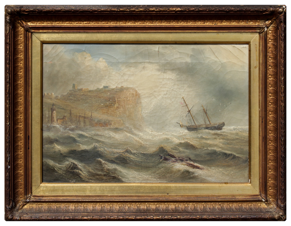 19TH C. PAINTING OF A SHIP WRECK OFF THE COAST: Oil/Canvas, 14'' x 21'', no visible signature, framed, 21'' x 28''.