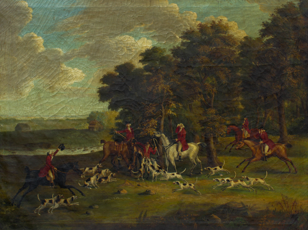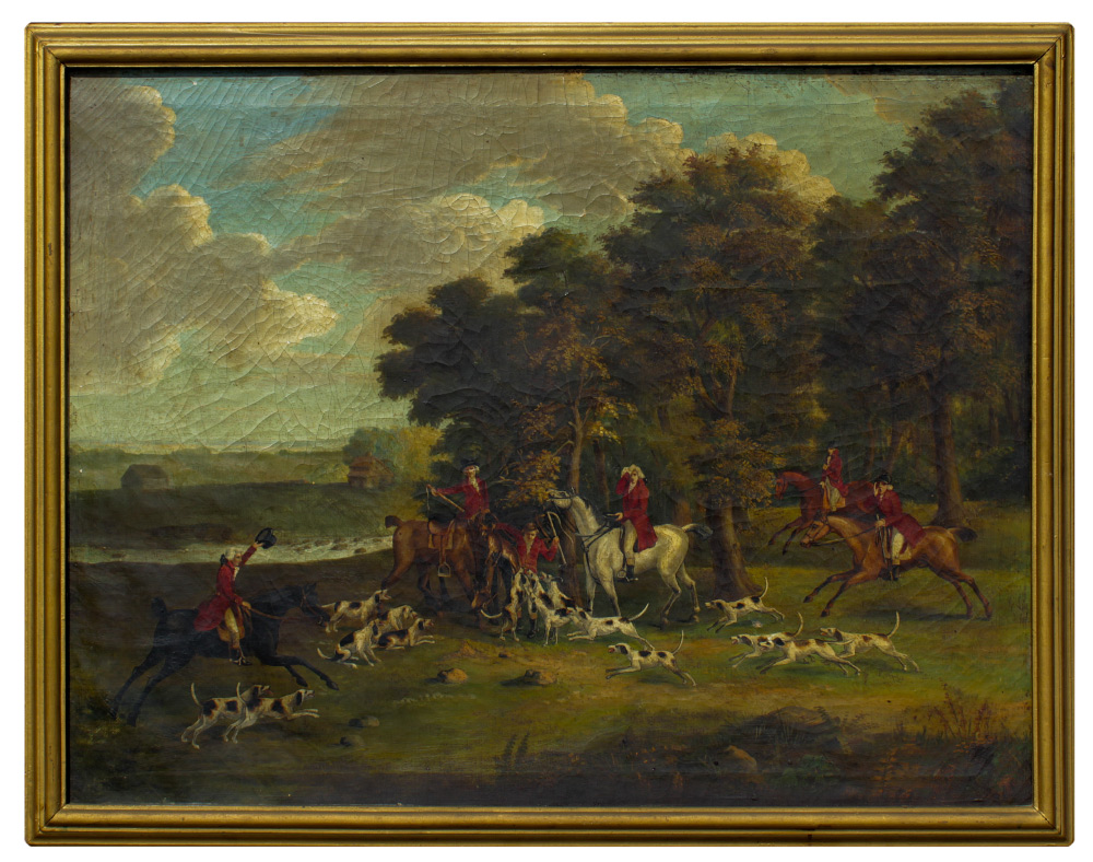 LARGE FOX HUNT PAINTING: Oil/Canvas, 32'' x 42'', no visible signature, Scene depicts the end of the hunt gathering, framed, 35 1/2'' x 45''.