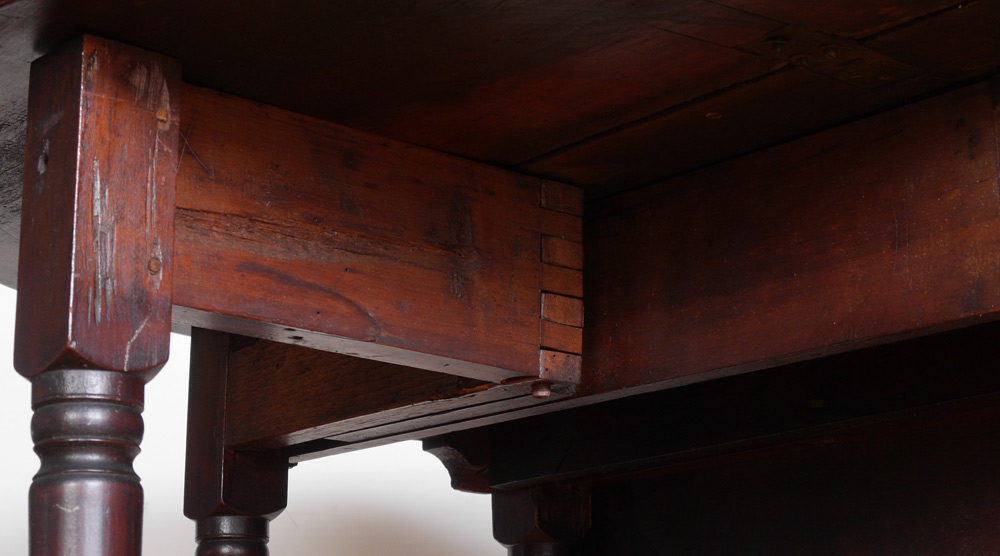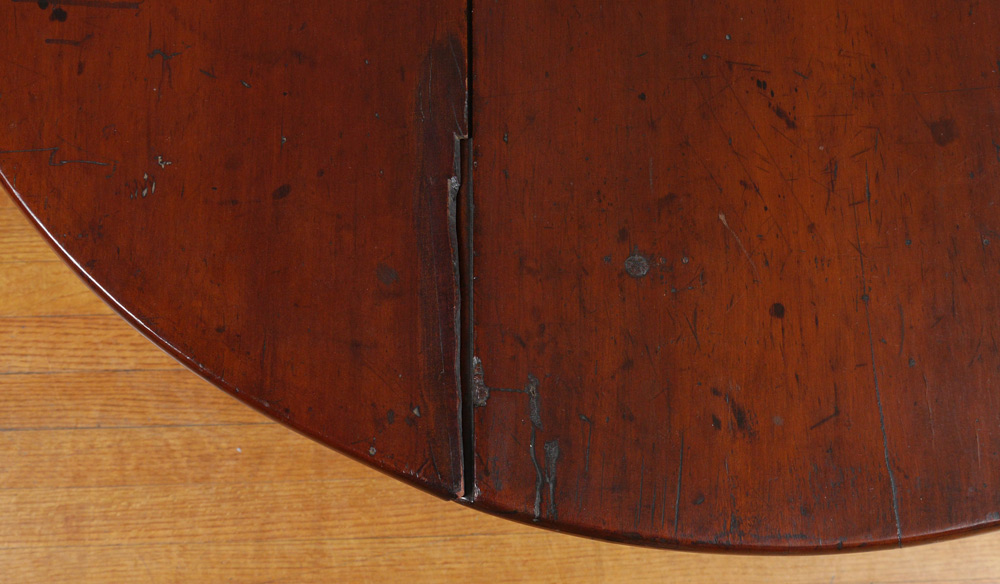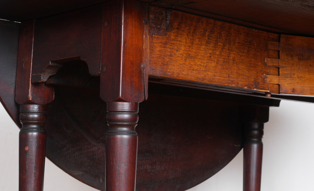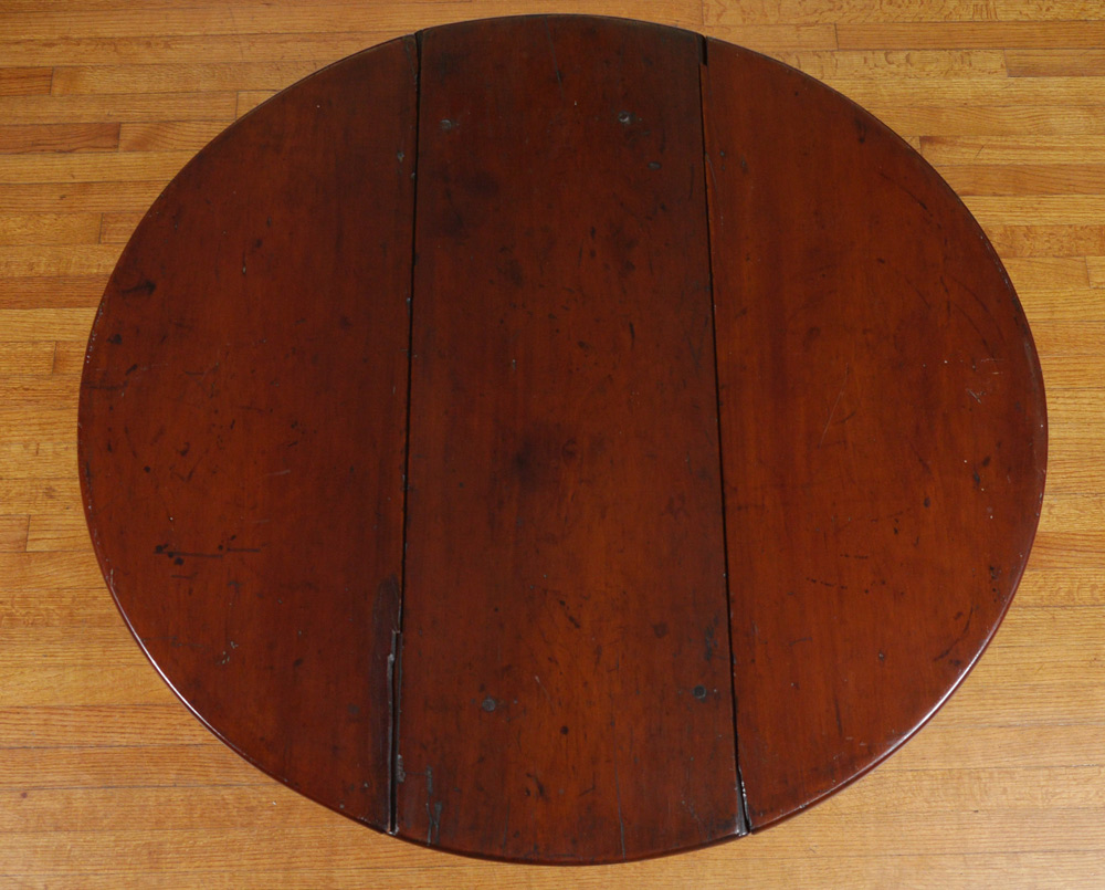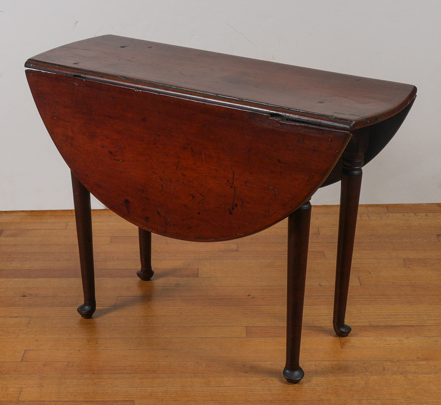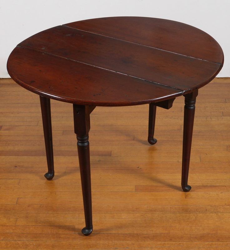 QUEEN ANNE MAHOGANY DROP LEAF TABLE: Early 19th century, pegged construction, turned legs ending in pad feet. Closed measures 27'' h. x 36 1/2'' x 13 1/2'', each drop leaf 13''.