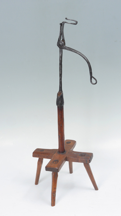 EARLY FLOOR STANDING IRON AND WOOD RUSH LIGHT: Wrought iron with hinged arm. Cross base with through peg legs, overall measures 31'' h. x 12 3/4'' x 12 3/4''.