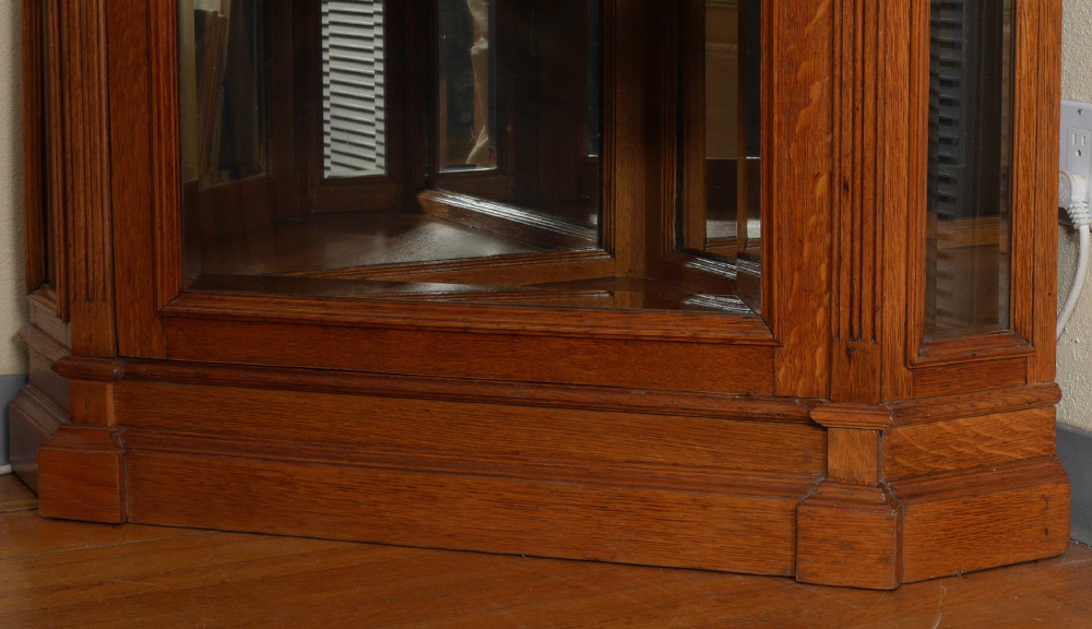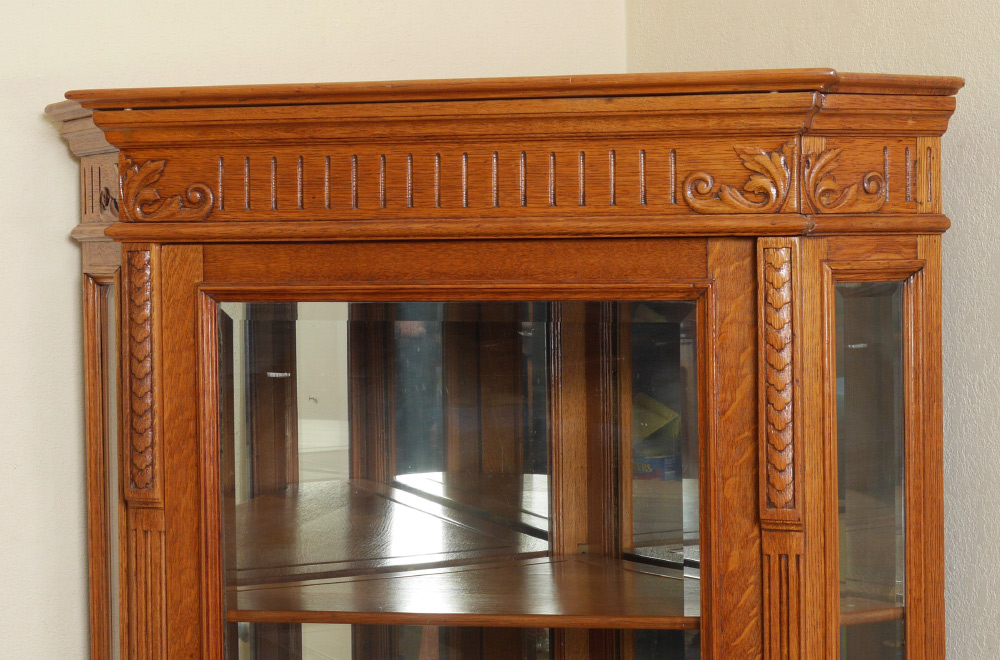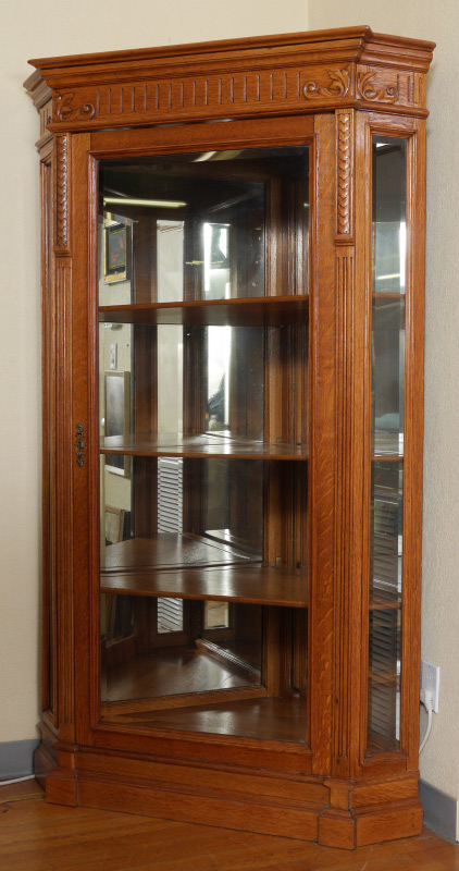 EASTLAKE CARVED GOLDEN OAK CORNER DISPLAY CABINET: Carved crest over single full length beveled glass door, beveled glass side windows, carved and fluted stiles. Mirror back interior with 3 wood shelves, measures 73'' h. x 43'' x 28''