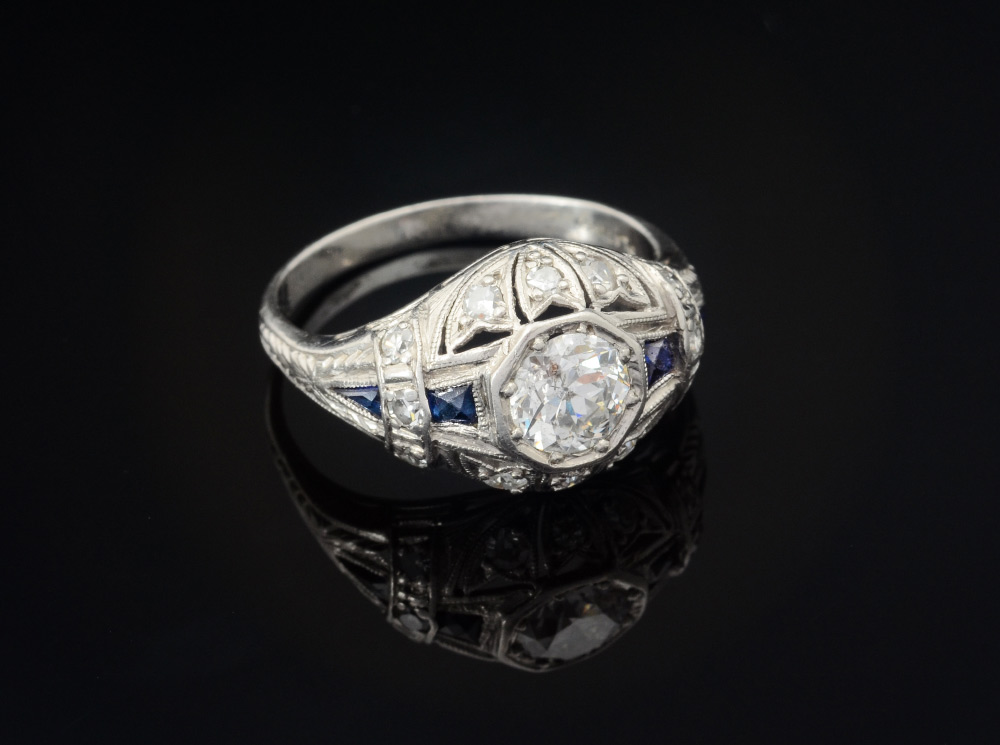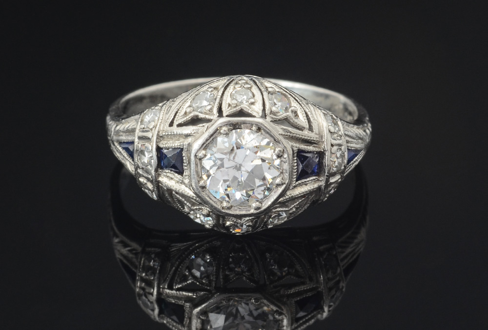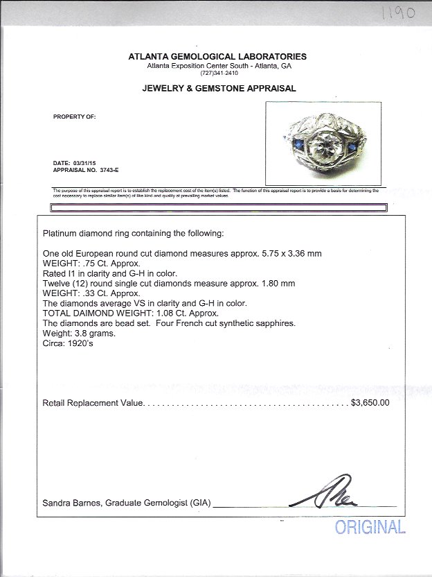 PLATINUM ART DECO DIAMOND RING CA. 1920'S: At the center is a .75 Ct old European round cut diamond of I1 clarity and G-H color. There are also .33 Ctw of 12 single VS diamonds and 4 French cut synthetic sapphires. Size 6. Weight 3.8 grams.