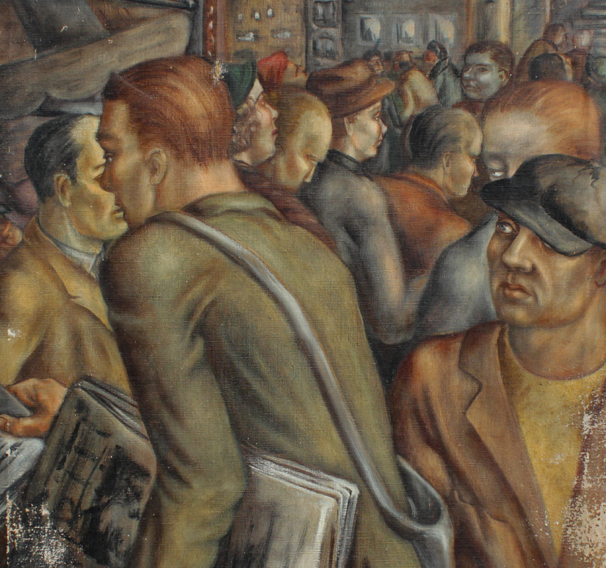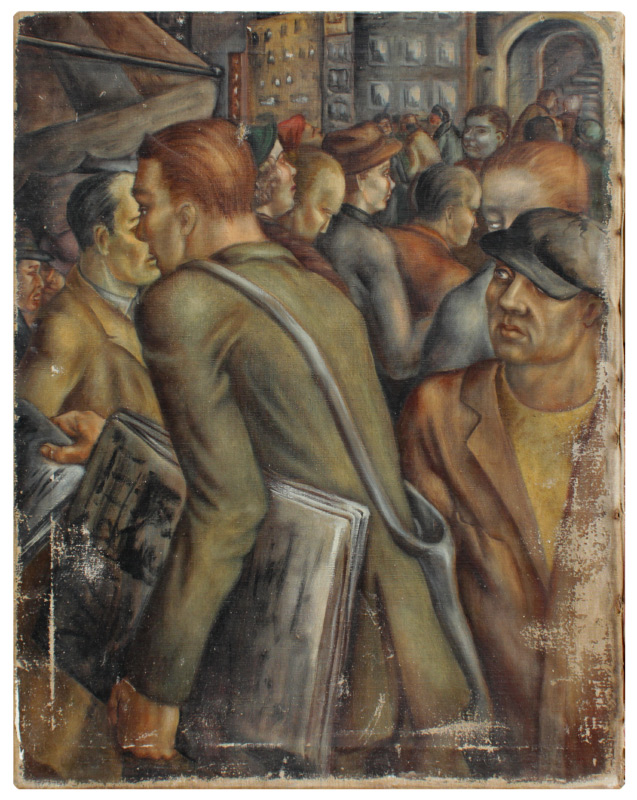 WPA ERA BUSY URBAN STREET SCENE PAINTING: Oil/Canvas, 30'' x 24'', no visible signature, unframed, the newspaper that the figure in the foreground is carrying reads 'War'.