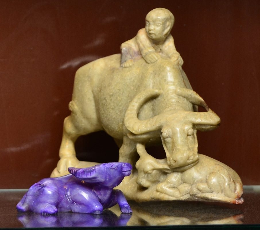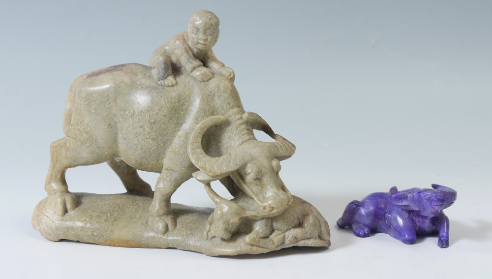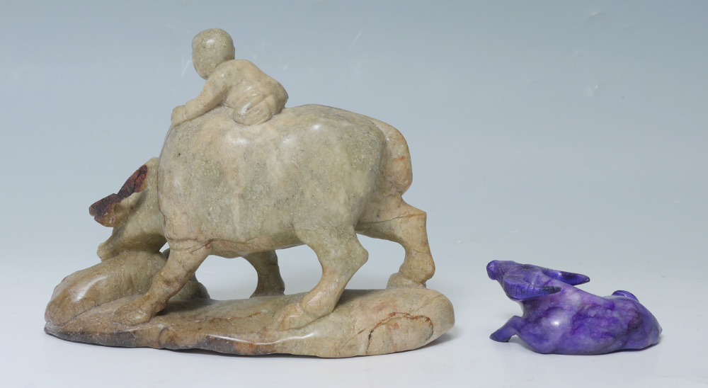 2 CARVED SOAPSTONE WATER BUFFALOS: 2 pieces total to include 1) Figure of a water buffalo and calf with child on its back. Measures 6'' h. x 8'' x 3 1/2''. 2) Figure of recumbent water buffalo in a vibrant died purple soapstone, 1 1/2'' x 3 1/2'' x 2''.