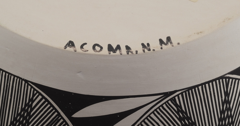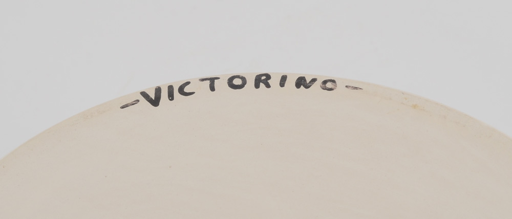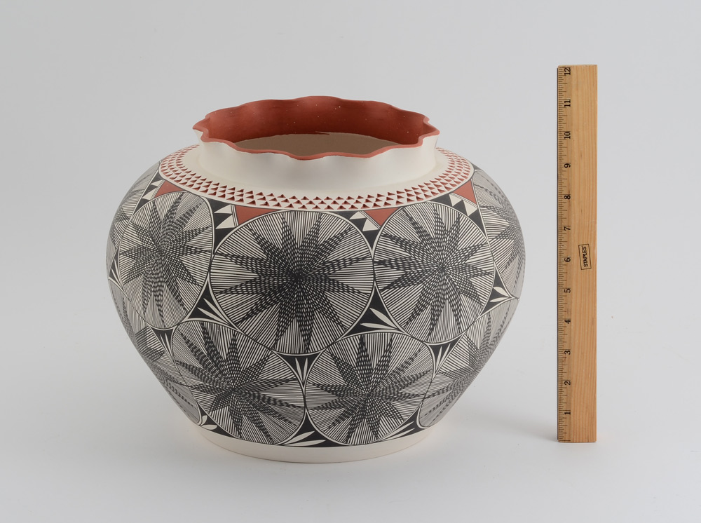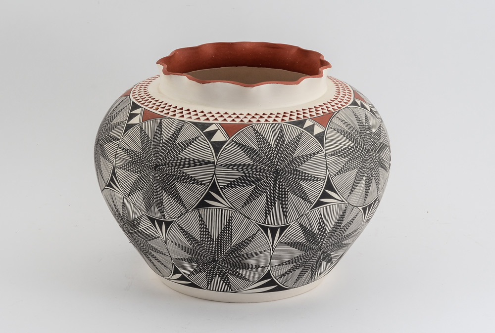 LARGE VICTORINO SOUTHWEST ACOMA OLLA: Ruffled rim, incised triangle pattern on shoulder, body with black and white geometric starburst in medallions motifs. Signed Victorino, Acoma, N. M. on base. Overall 10'' h. x 13 3/4''.