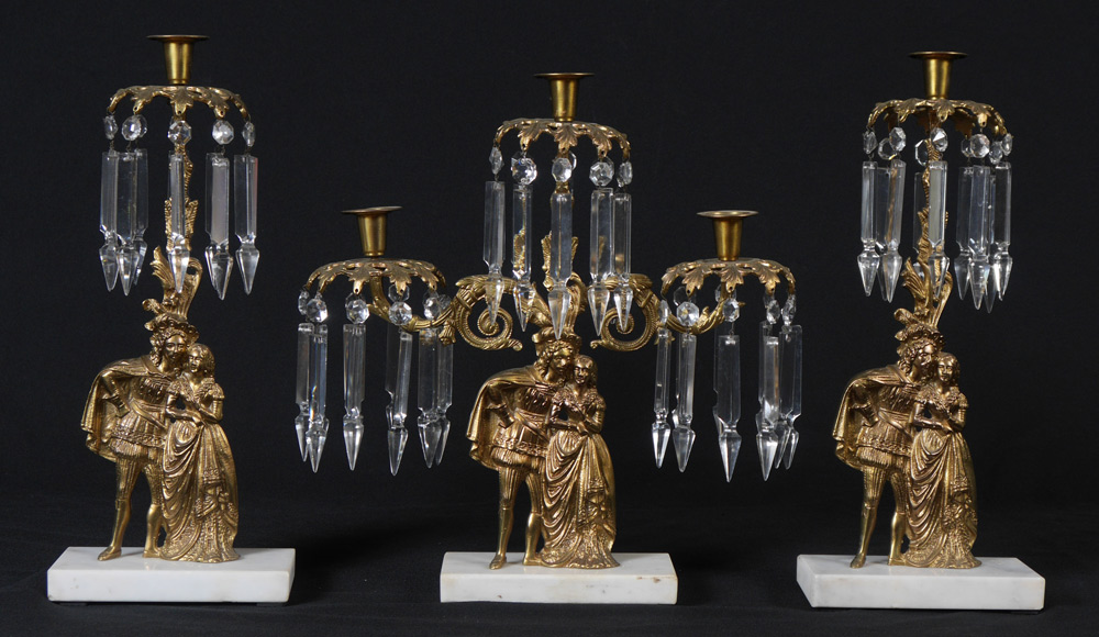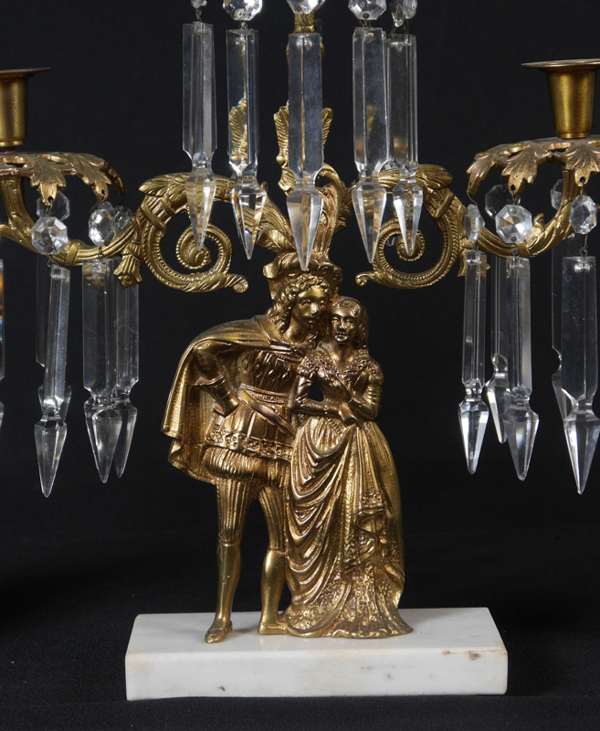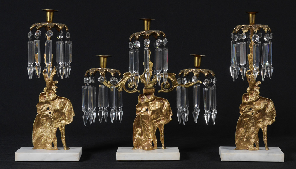 FIGURAL BRASS AND CRYSTAL 3 PC GIRANDOLE SET: One 3 arm and a pair of single light girandole, brass male and female figures on marble bases, sparkling with prisms. Center 14 3/4'' x 14'', sides 15 1/2'' h.