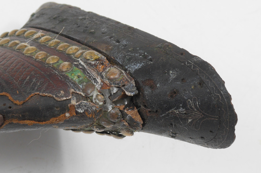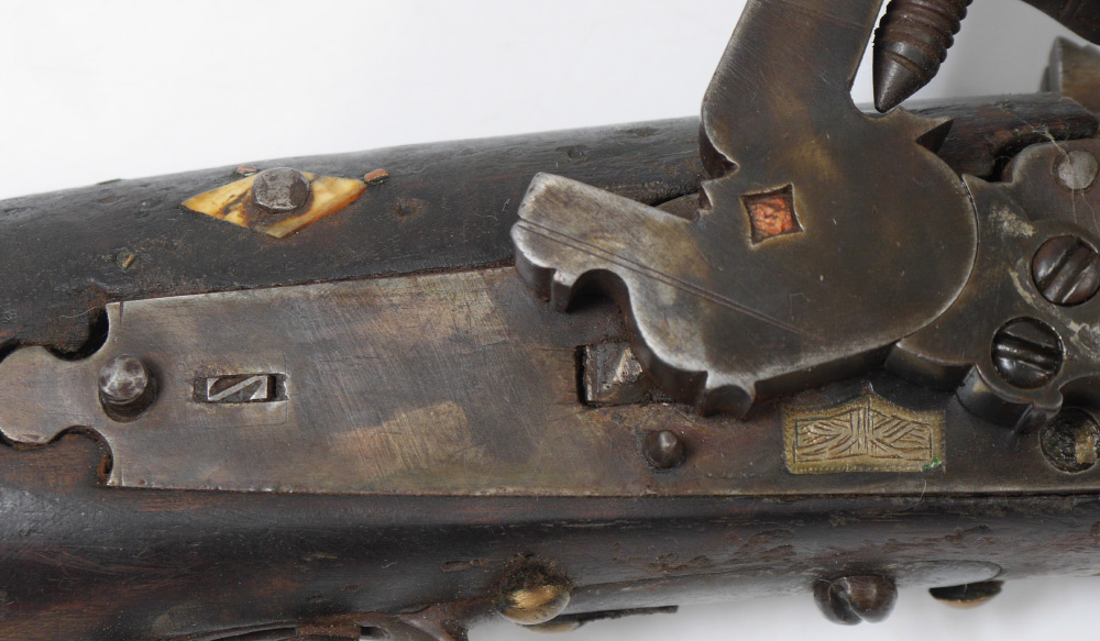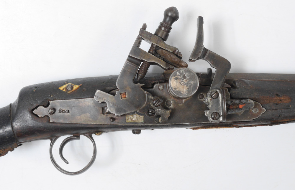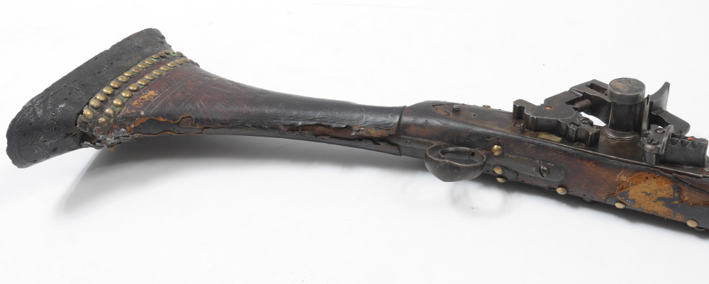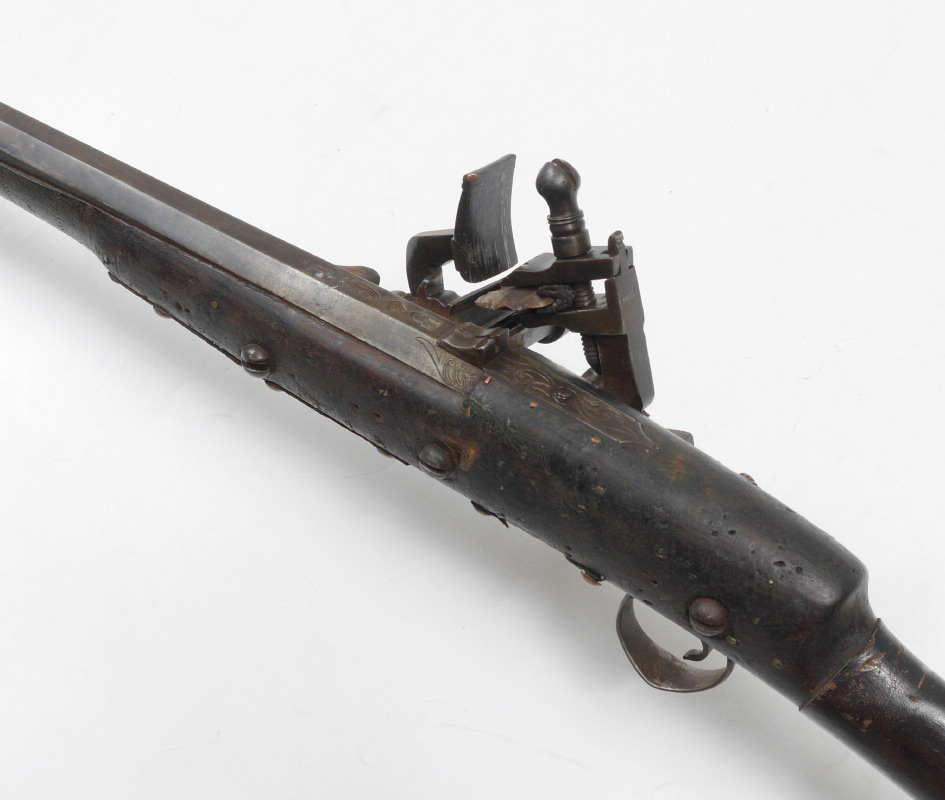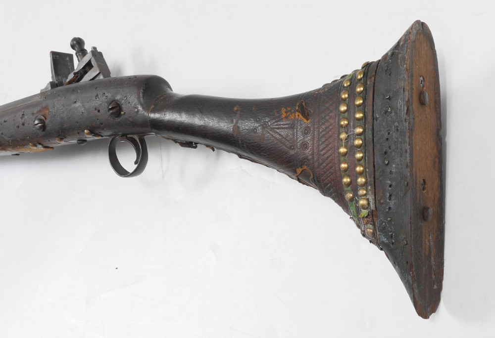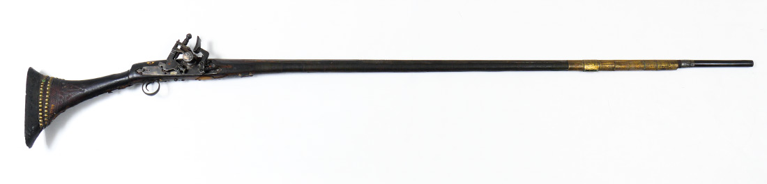 PERSIAN MIQUELET FLINTLOCK LONG RIFLE: 55 3/4'' octagon / round approx. .60 caliber smoothbore barrel with carved decoration with engraved brass collars. Nearly full stock with striated design, partial tacked embossed leather covers. Miquelet lock currently functions, armourers stamps on lockplate and top of barrel. Missing 2nd half of butt and crude repair to what remains. Overall 70 1/4'' long.