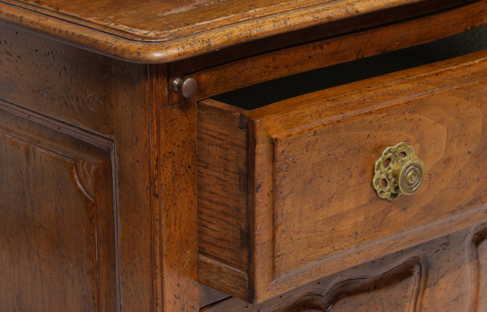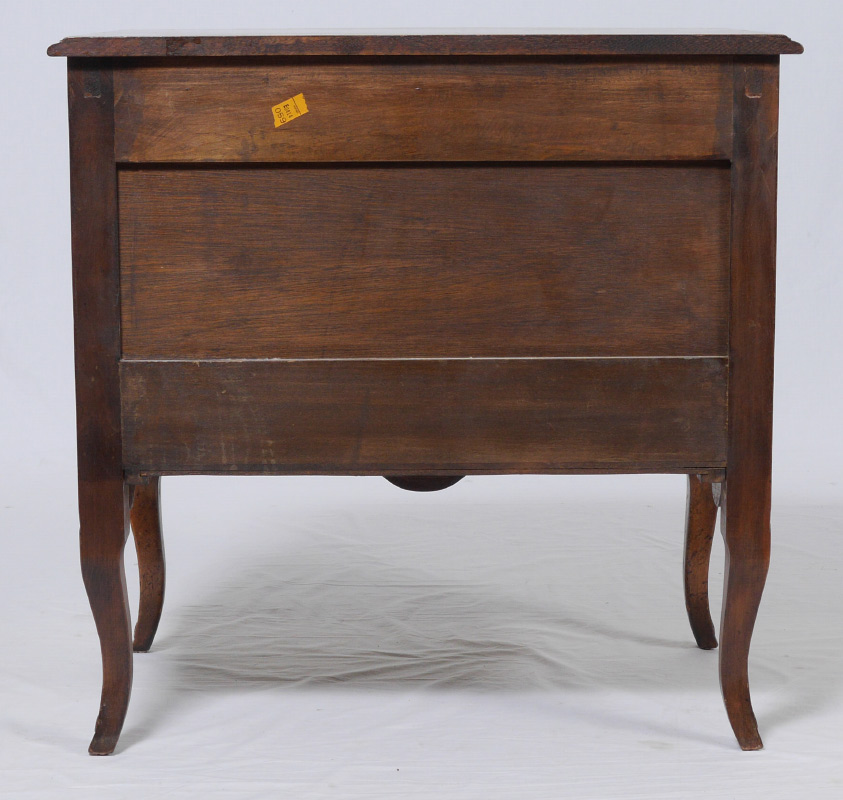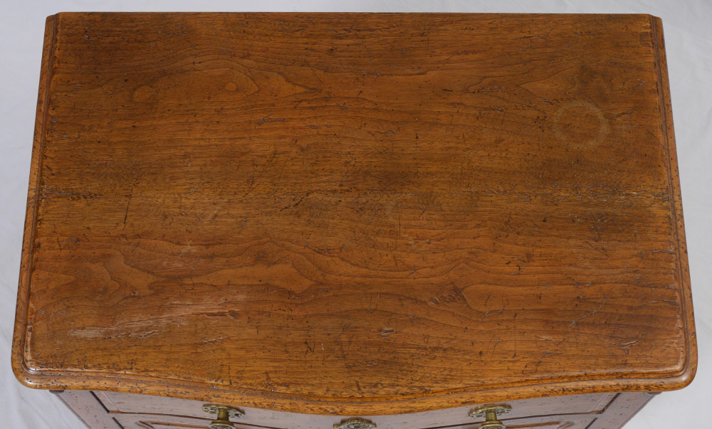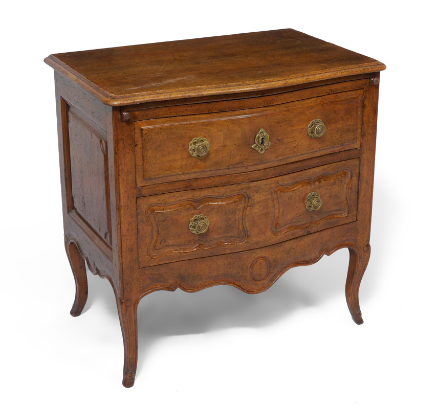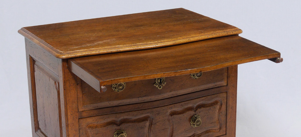 DON RUSEAU 2 DRAWER NIGHT STAND OR END TABLE: Walnut stand by Don Ruseau NYC, bowed front, 2 drawers, lower drawer with carved accents, carved and shaped skirt and legs. Overall measures 27 3/4'' h. x 28'' x 18 1/4''. Estate of Emanuel Zorchnoy