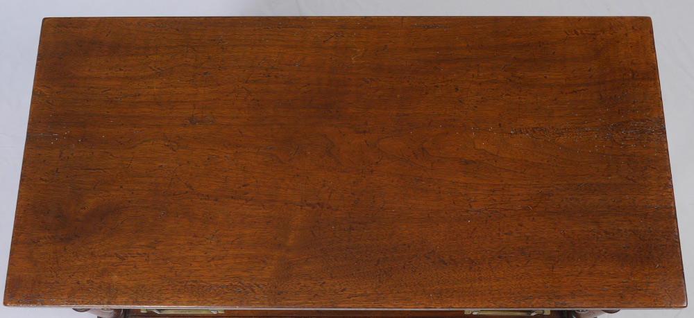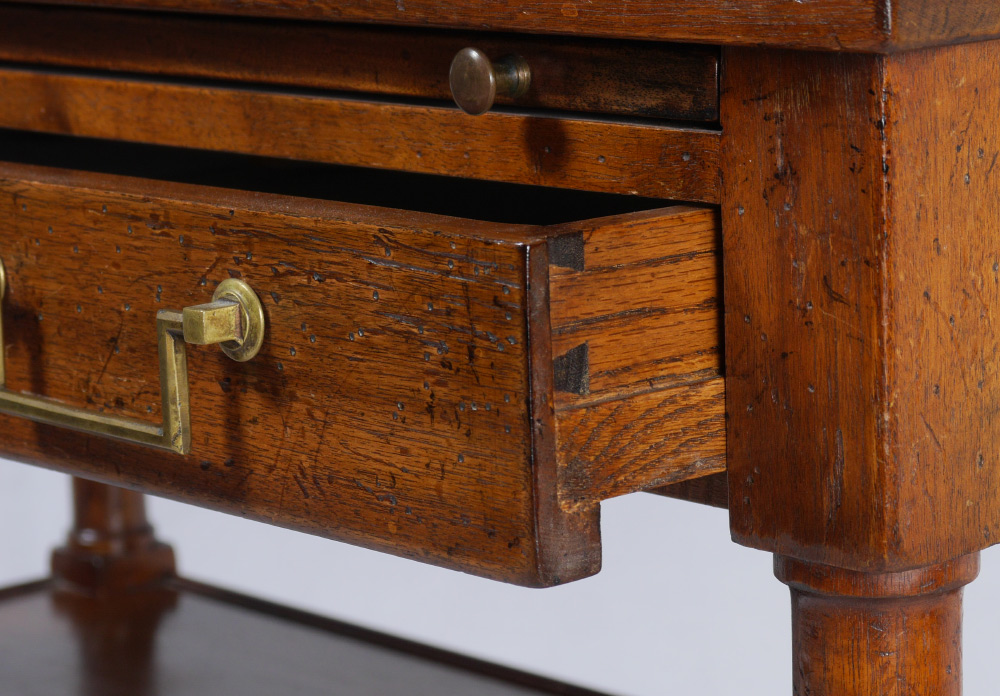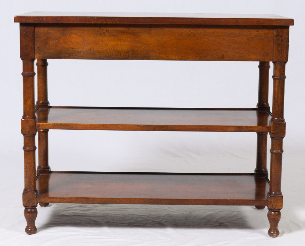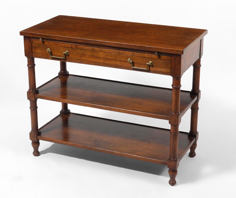 DON RUSEAU COUNTRY FRENCH WALNUT SERVER: Server by Don Ruseau NYC, sliding pull out shelf over drawer over 2 open shelves. Turned supports and feet, overall measures 28 1/4'' h. x 34'' x 16''. Estate of Emanuel Zorchnoy