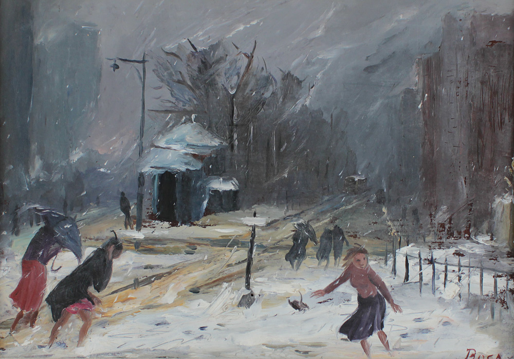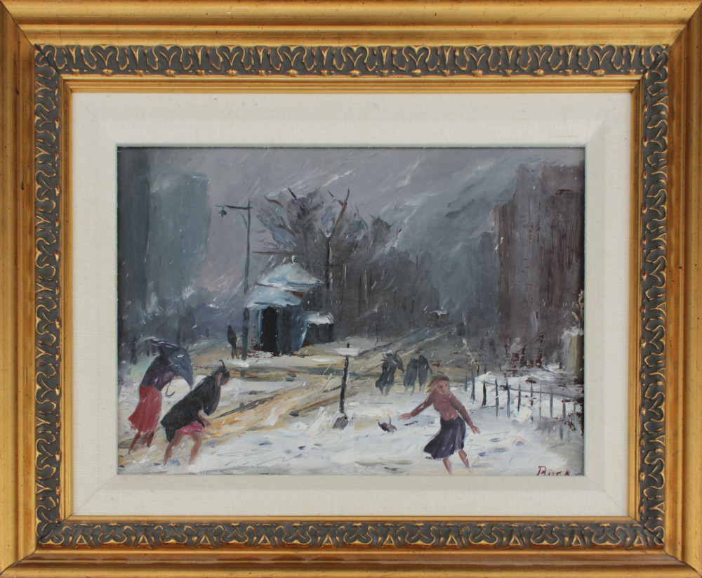 BOSA, Louis, (American, 1905-1981): Figures in a Windy Winter Urban Street Scene, Oil/Masonite, 8'' x 12'', signed lower right, numbered verso, 93.47.6, contemporary frame, 12 1/2'' x 16 1/2''.