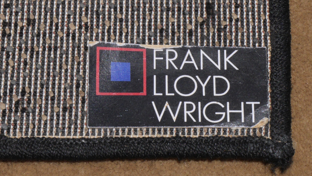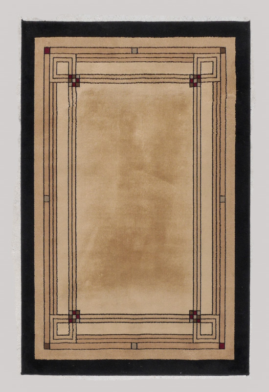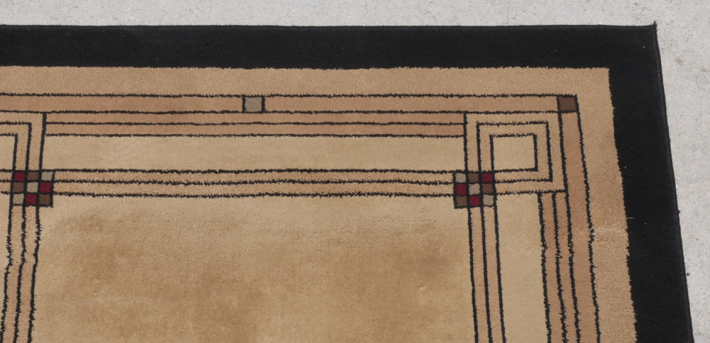 FRANK LLOYD WRIGHT CARPET 5' 3'' x 7' 7'': Contemporary machine made rug with earth tones and geometric designs with black border, Frank Lloyd Wright inspired design.
