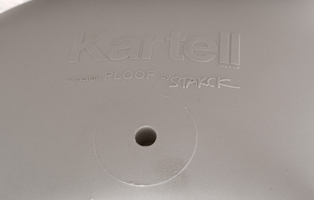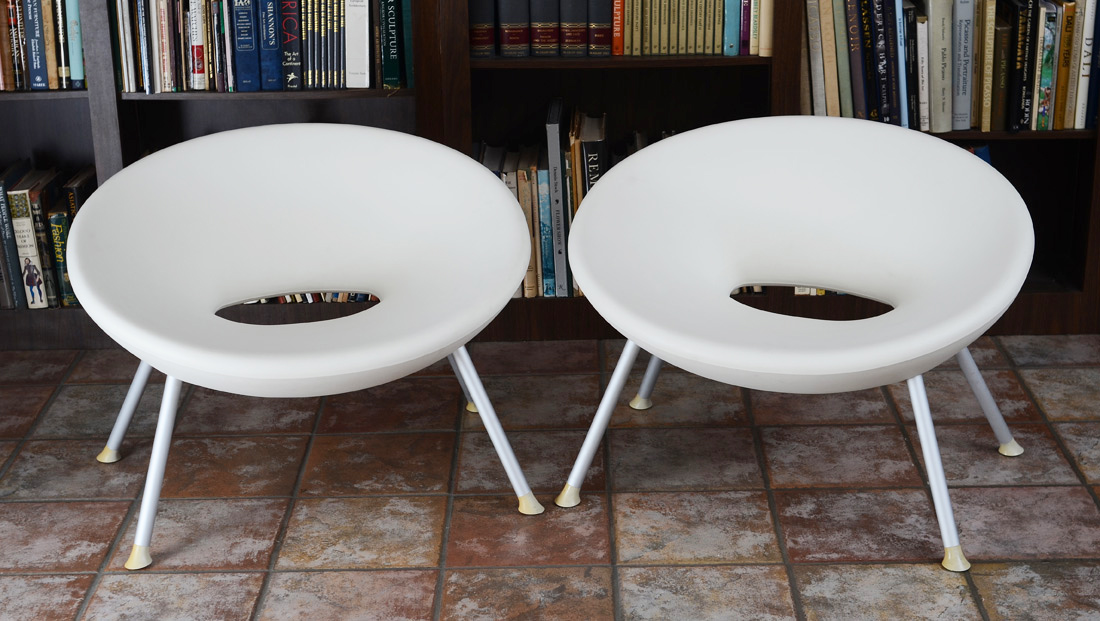 PAIR PHILIPPE STARCK FOR KARTELL PLOOF ARMCHAIRS: Molded white plastic chairs with metal legs, designed by Philippe Starck for Kartell, Made in Italy. Overall measure 26 1/4'' x 33 1/4'' x 25 1/2''.