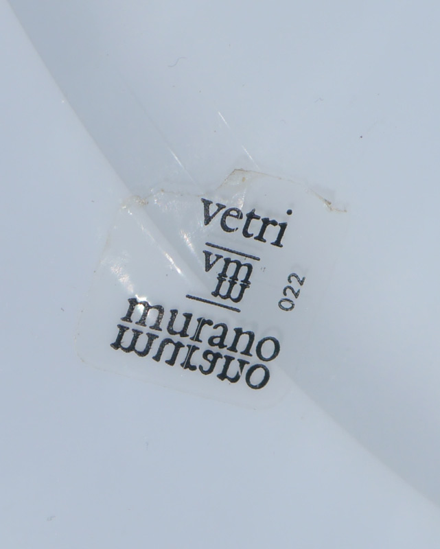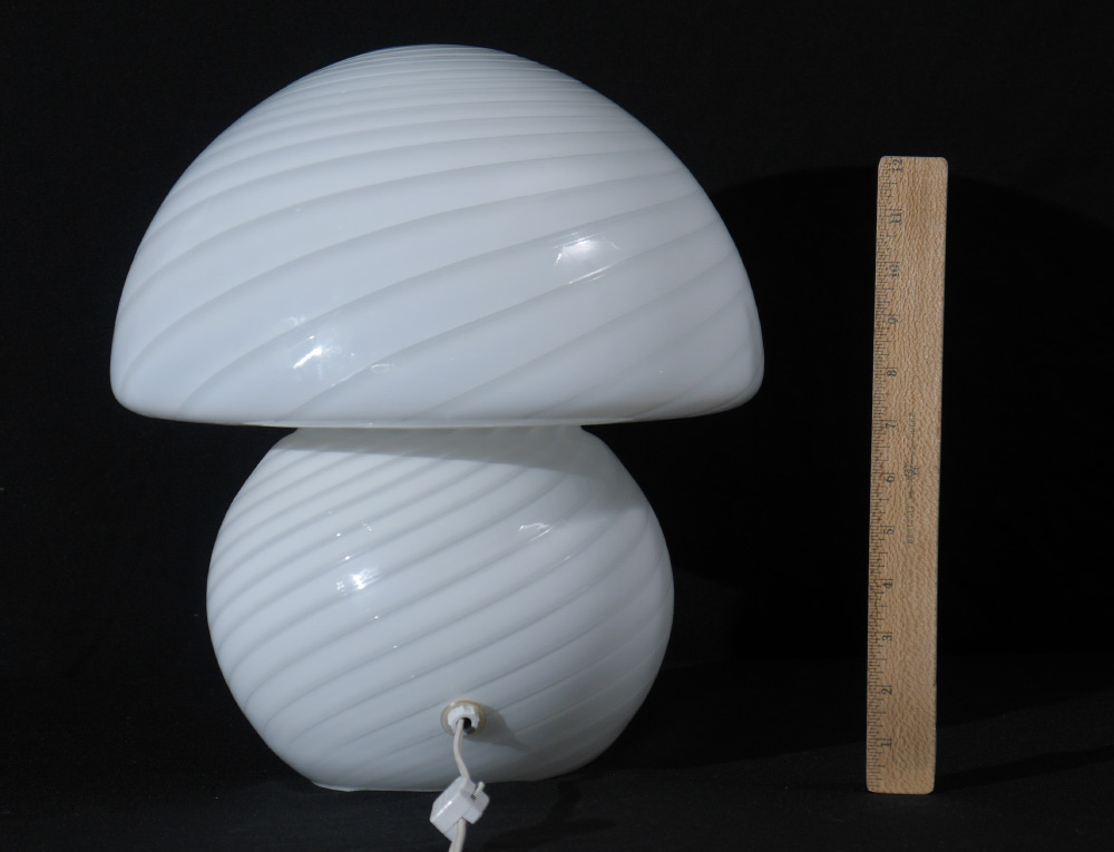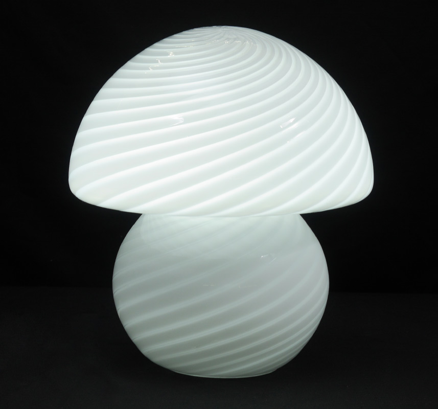VETRI MURANO SWIRL GLASS MUSHROOM TABLE LAMP: White swirl canes on connected shade and body, original Vetri Murano sticker. 15'' h. x 12 1/2''.