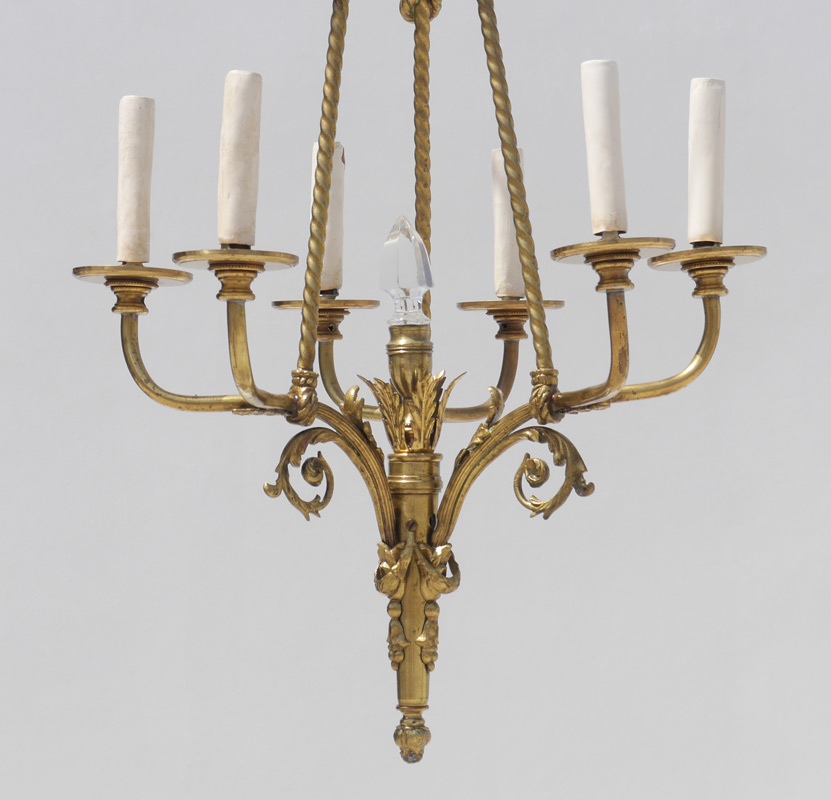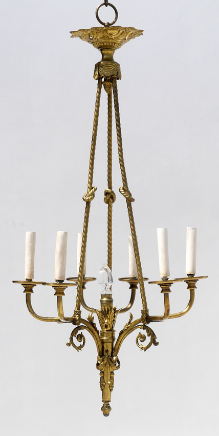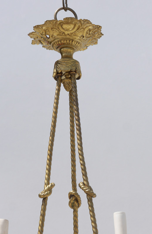 FRENCH EMPIRE STYLE BRASS CHANDELIER: Gilt brass with rope and knot supports, 3 arm with 6 lights, foliate scroll accents, overall measures 34'' h. x 16''.