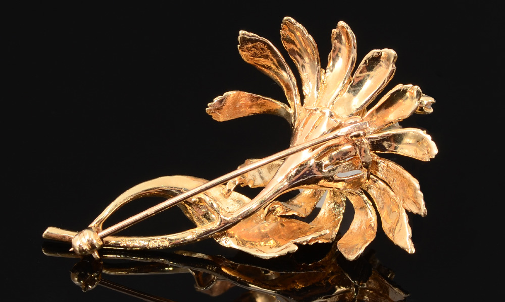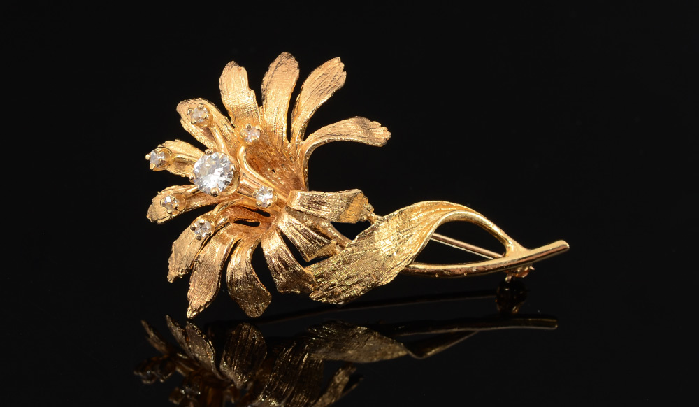 DIAMOND FIGURAL FLOWER PIN: 14K yellow gold flower pin contains one round brilliant cut diamond and 6 round single cut diamonds totaling approx. .42 Ct., rated VS in clarity and H-I in color. The diamonds are prong set. Bar pin closure. Length 1 3/4''. Weight: 7.6 grams.