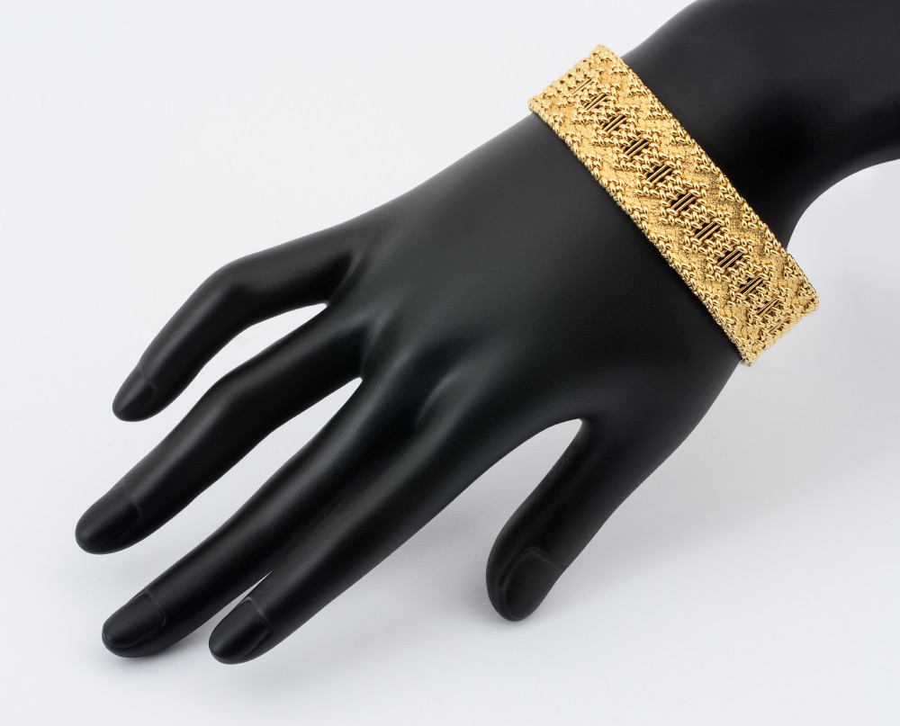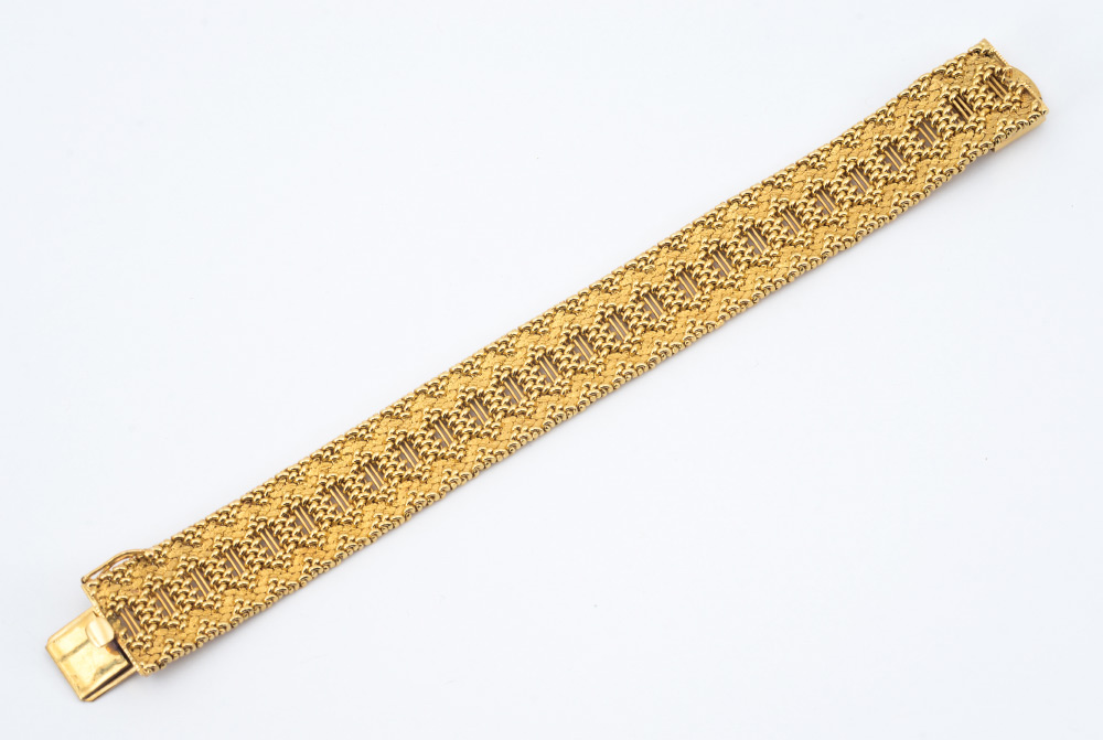 14K YELLOW GOLD MESH BRACELET: An intriguing pattern of bars and mesh. Signed Z&F for Zelman Freidman NY. Length 7.5''. Width .75''. Weight approx. 53.4 grams.