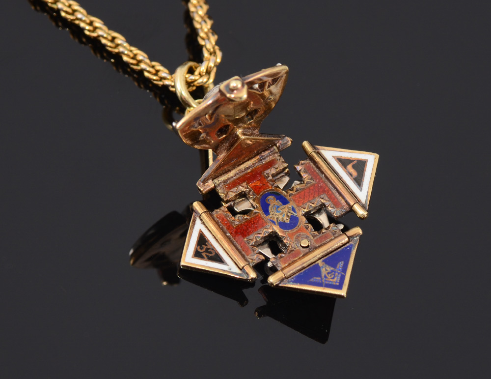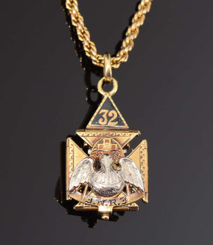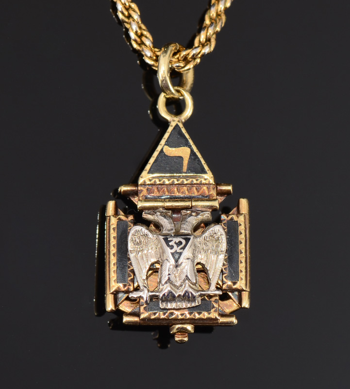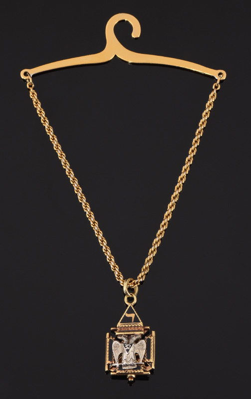 MASONIC SCOTTISH RITE FOB PENDANT ON HANGER: 14K yellow gold decorative hanger and chain with hinged transforming fraternal pendant/charm. 32 degree. Weight: 12.3 grams.