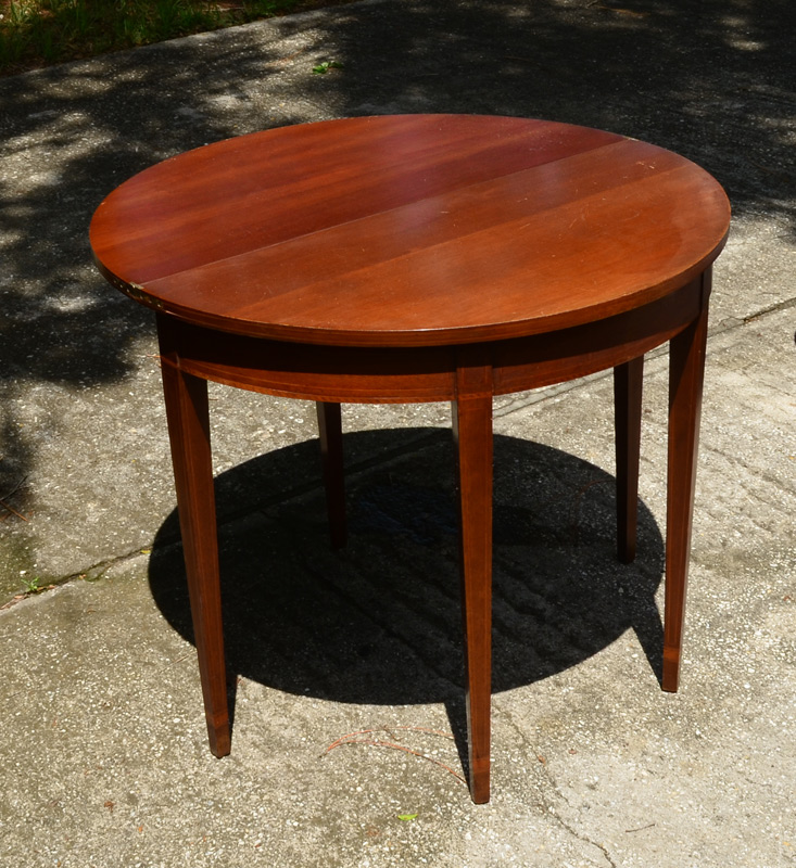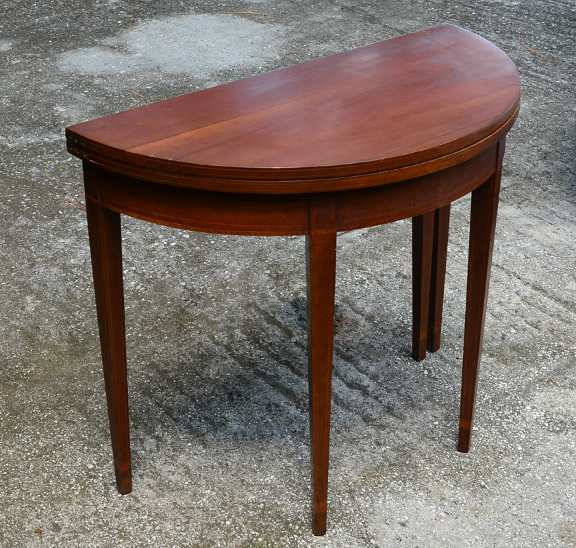 MAHOGANY DEMILUNE GAME TABLE: Flip top with gate leg, string inlay on sides, apron, and tapered legs. Overall measures 30 1/4'' h. x 35 3/4'' x 18''.