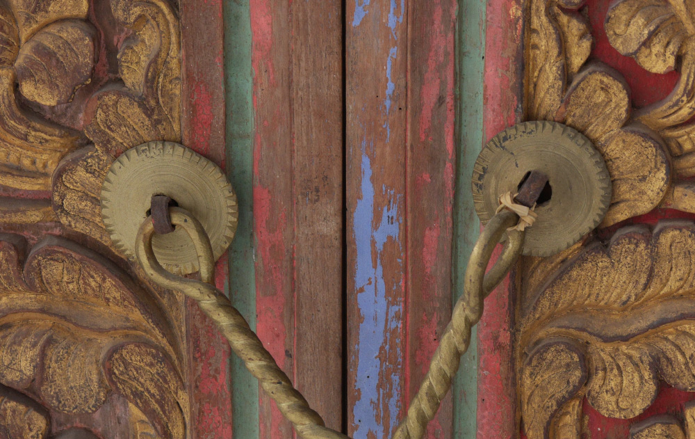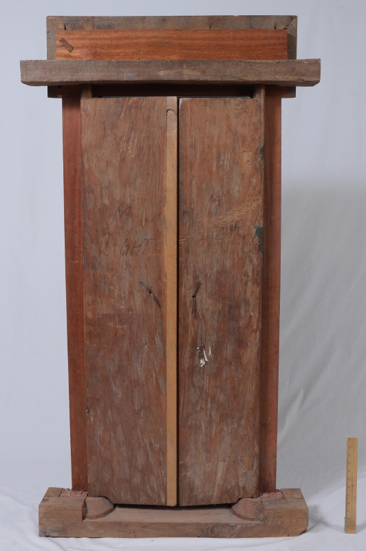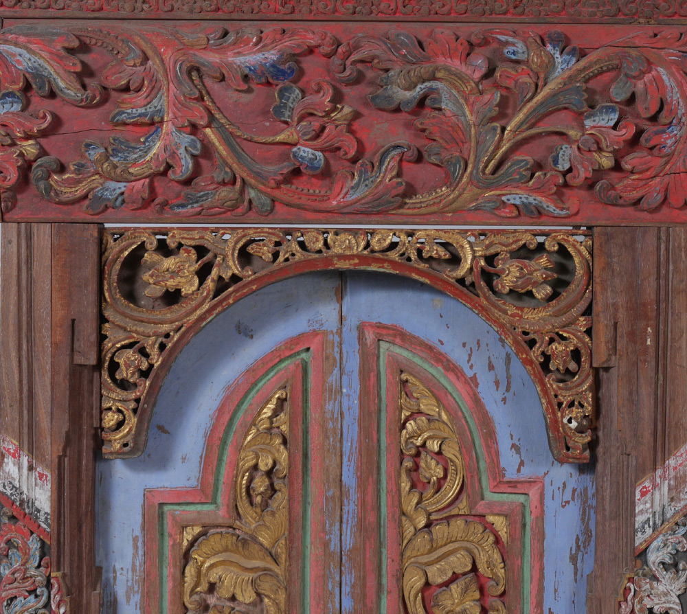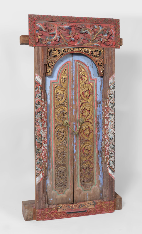 NEPALESE CARVED POLYCHROME PAINT DECORATED WINDOW: Polychrome paint decorated, frame and doors with carved foliate motifs. Brass handles, overall with support 62 1/2'' h. x 33 3/4'' x 5 3/4''.