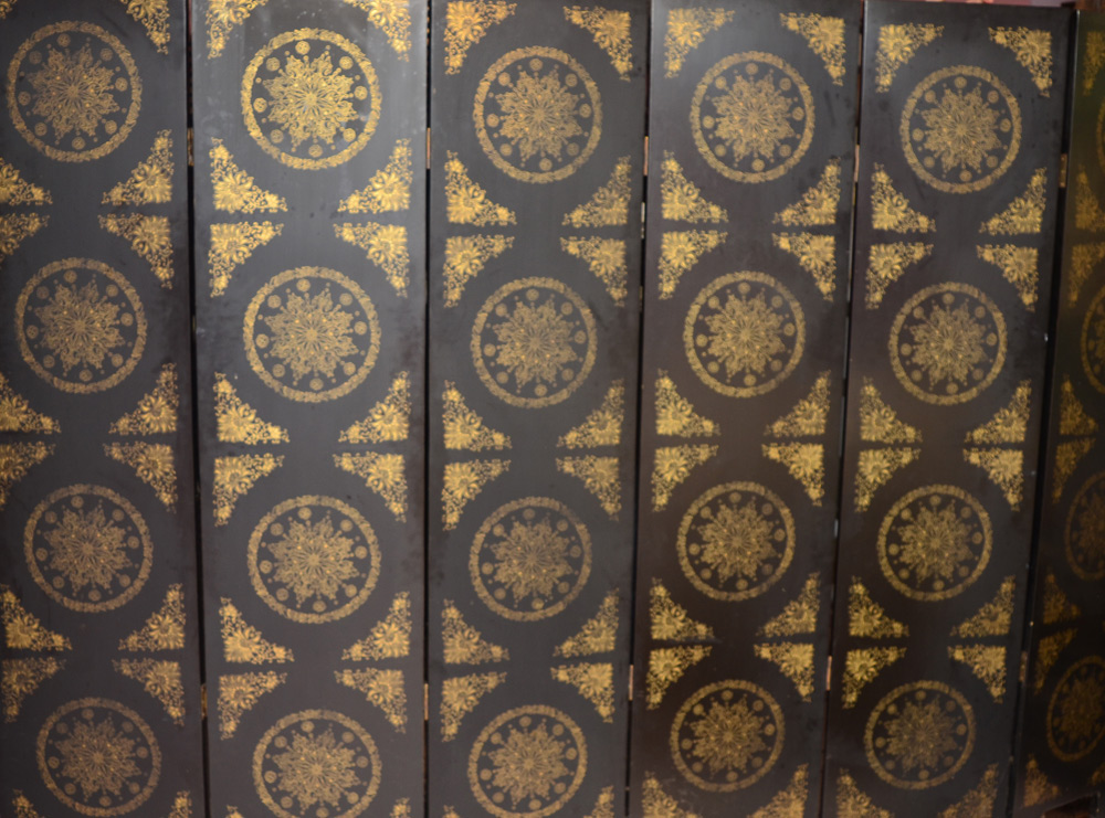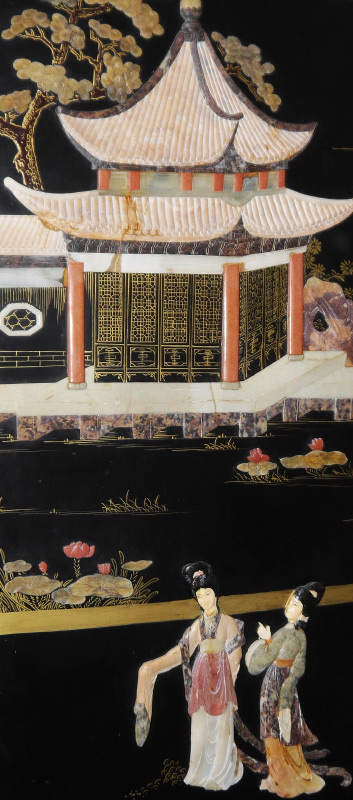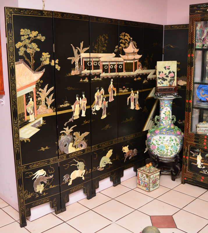 6 PANEL CHINESE COROMANDEL SCREEN: Black lacquer ground, one side with applied stone decoration of typical genre scenes, the other with patterned gilt decoration. Each panel 72'' x 16'' x 1''.