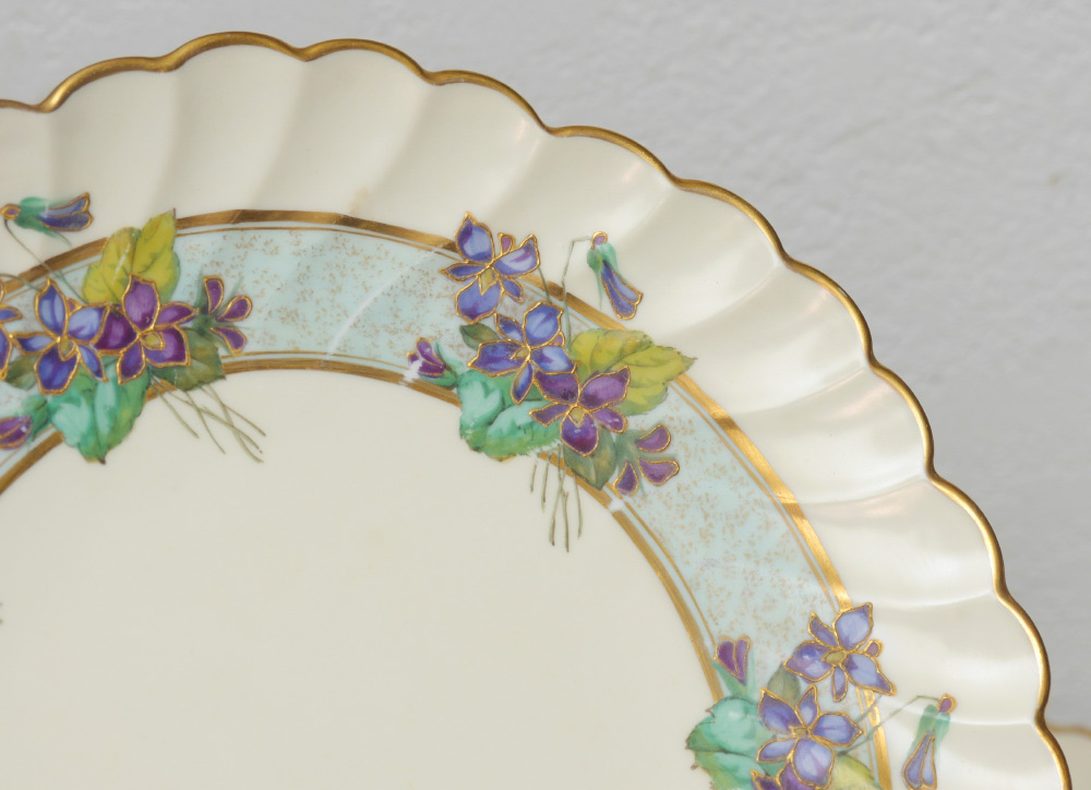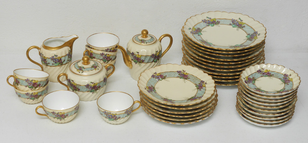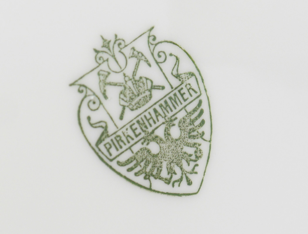 PIRKENHAMMER FINE CHINA: 35 piece scalloped rim and gold enhanced fine china to include 11 plates (8 3/4''), 6 plates (7 1/2''), 8 plates / saucers (5 1/2''), 7 cups, a small coffee pot (5 1/2''), creamer and sugar.