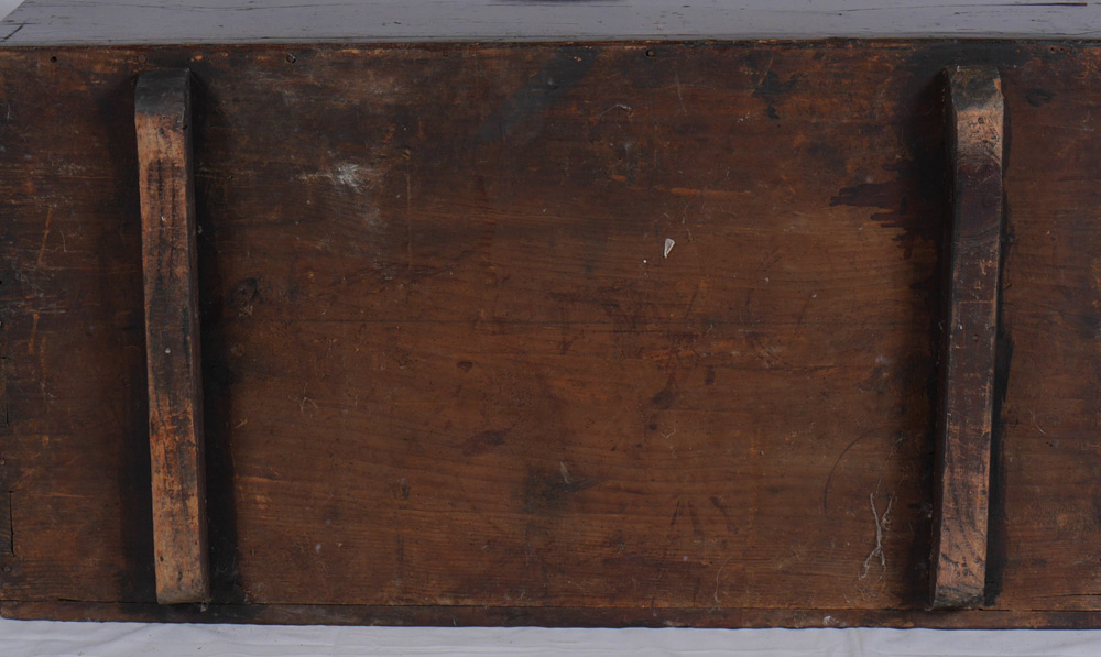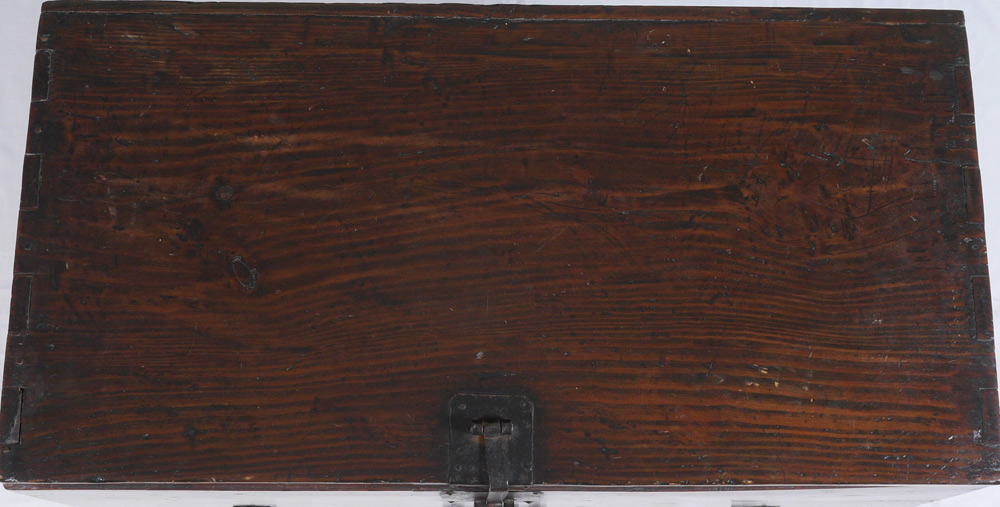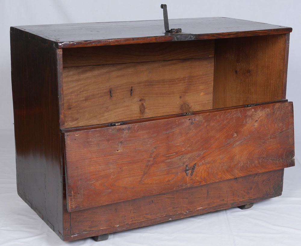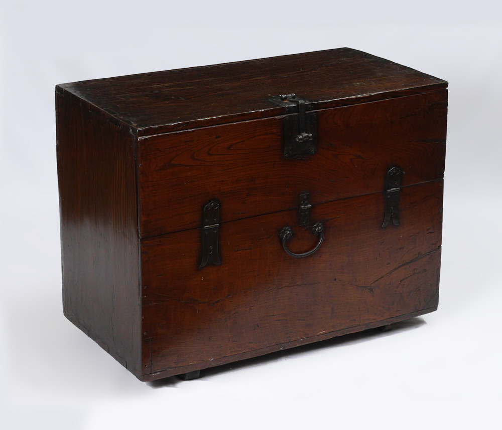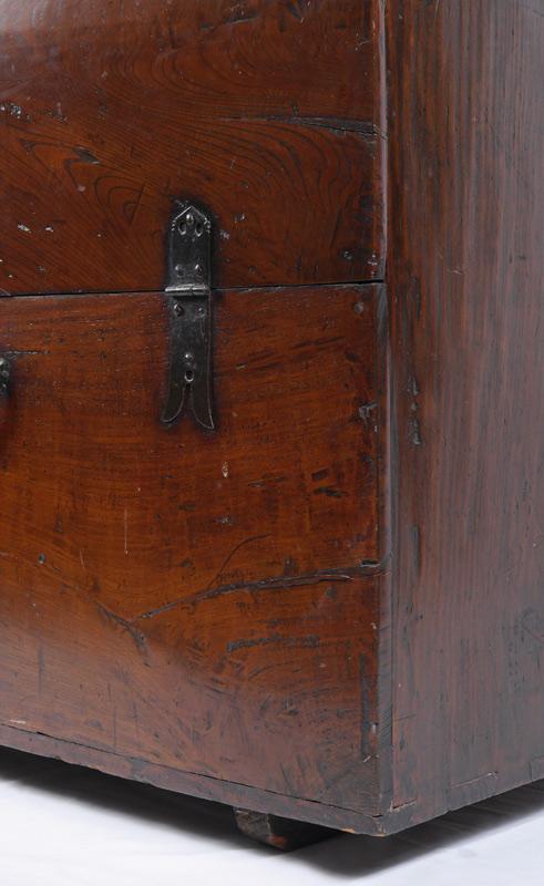 KOREAN BANDAJI BLANKET CHEST: Front with drop front top half door, iron hardware, internal open storage. Overall measures 25'' h. x 32 1/2'' x 17 1/2''.
