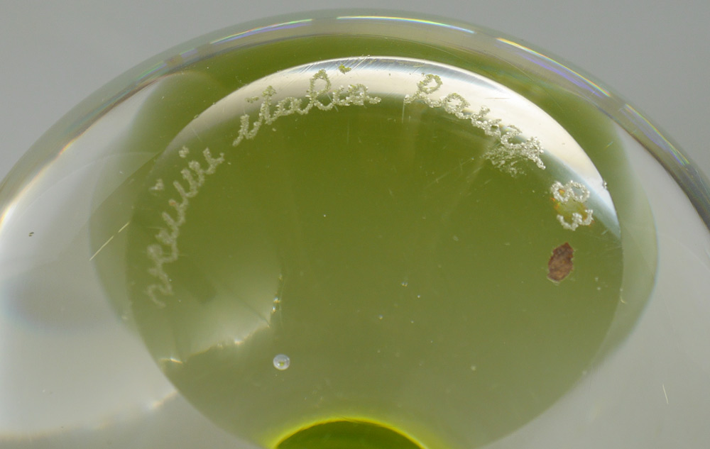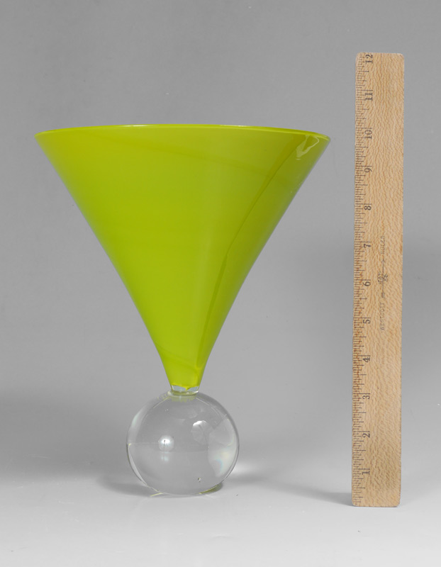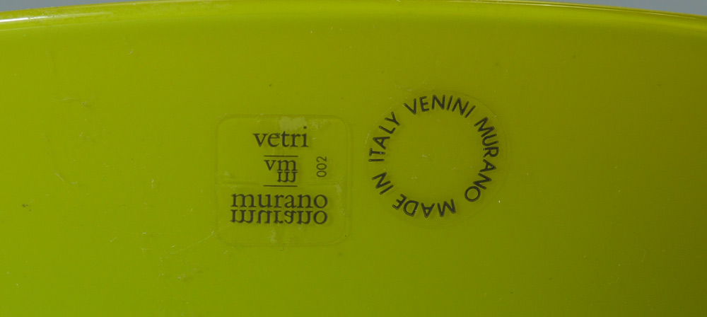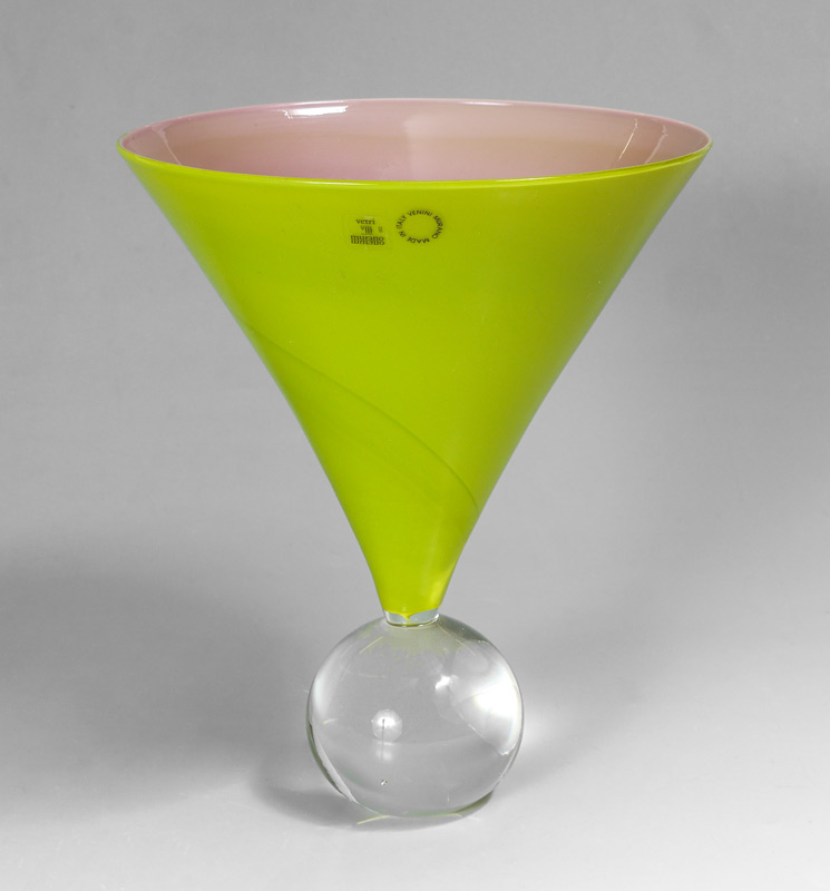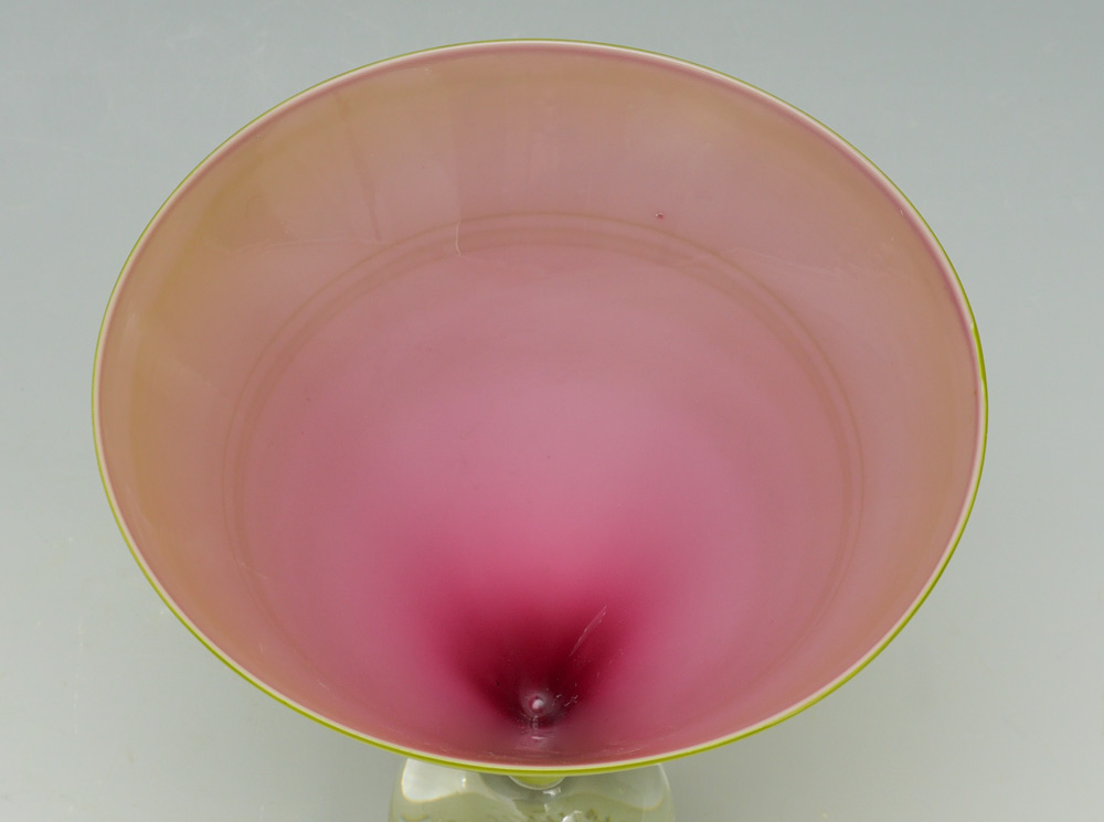 SIGNED VETRI MURANO ART GLASS VASE: Flared bowl with graduating shades of green outside, pink inside. Clear ball base with etched signature and dated '83, original Vetri Murano sticker on side. 9 3/4''h. x 8 1/4'' diam.
