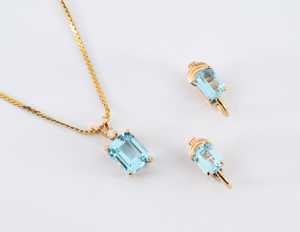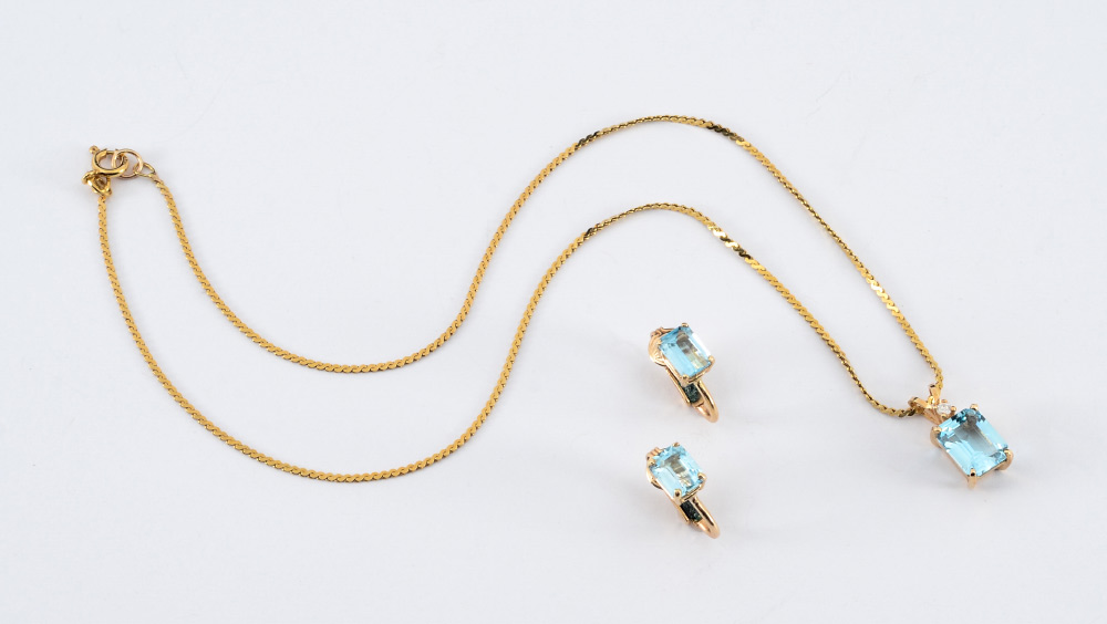 BLUE TOPAZ NECKLACE & EARRING SET: 14K yellow gold necklace and earrings contain 3 emerald cut ''Sky'' blue topaz totaling approx. 6.00 Ct. In the pendant is one round full cut diamond. Weight: .04 Ct. Approx. Rated VS in clarity and H in color. The topaz are prong set. Hinged clip closures. 14K 16'' gold chain attached. Weight: 8.6 grams.
