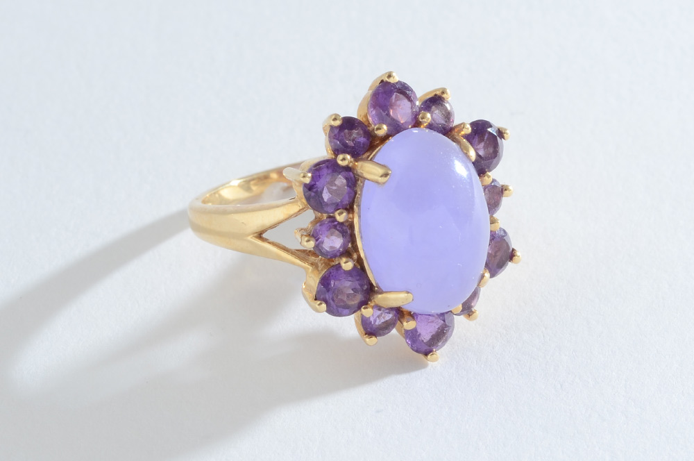 LAVENDER JADE & AMETHYST RING: 14K yellow gold ring centers an oval 8.00 x 4.00 mm lavender jade cabochon framed by 12 round amethyst. Amethyst total approx. 1.20 Ct. Weight: 6.5 grams. Size: 9.5.