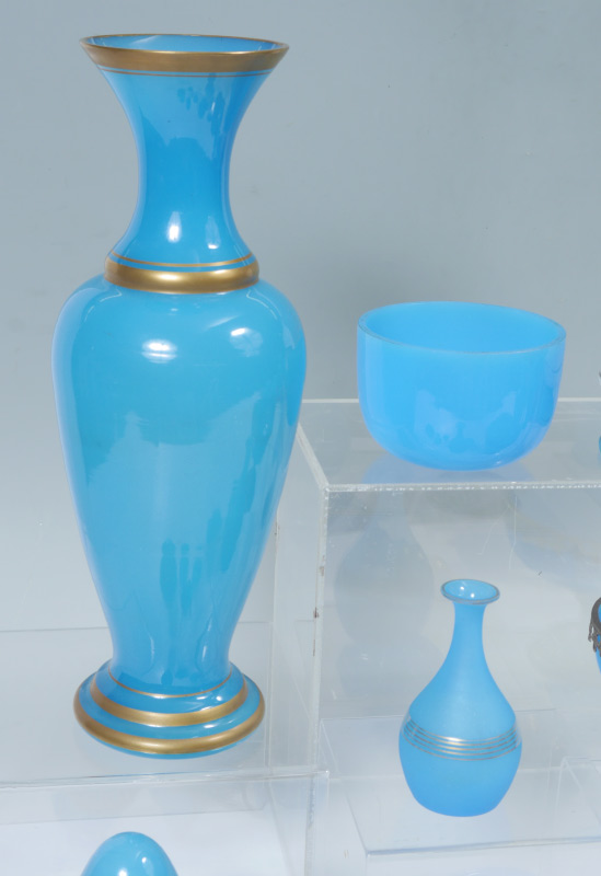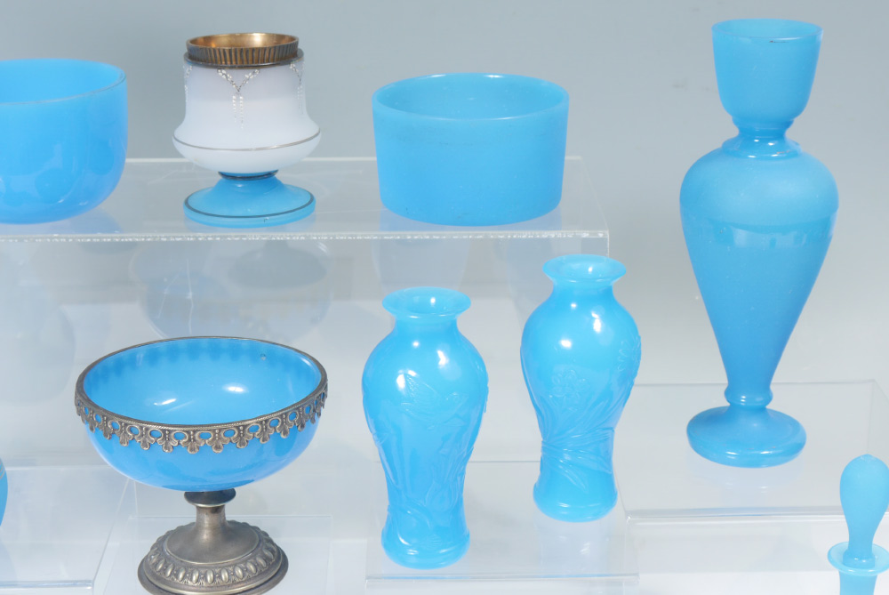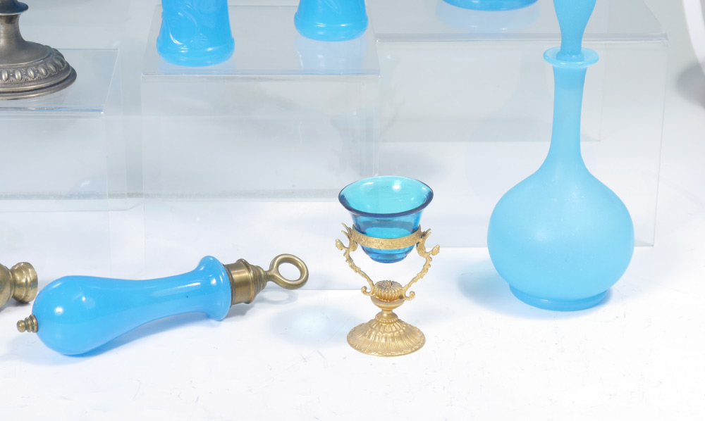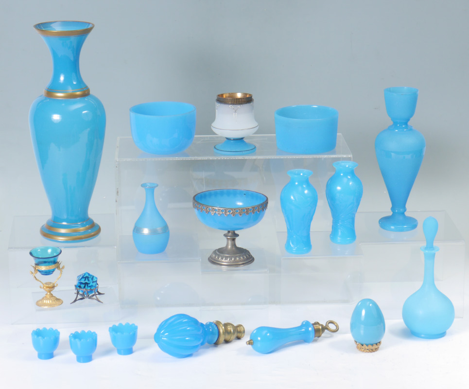 COLLECTION OF BLUE OPALINE GLASS: 18 pieces total, 16 with opaline glass to include vases, candle holders, perfumes, metal mounted footed bowl, egg and more. Tallest vase measures 16'' h. x 5 1/2'' . Tradition holds that this collection was purchased from the Helena Rubenstein estate.