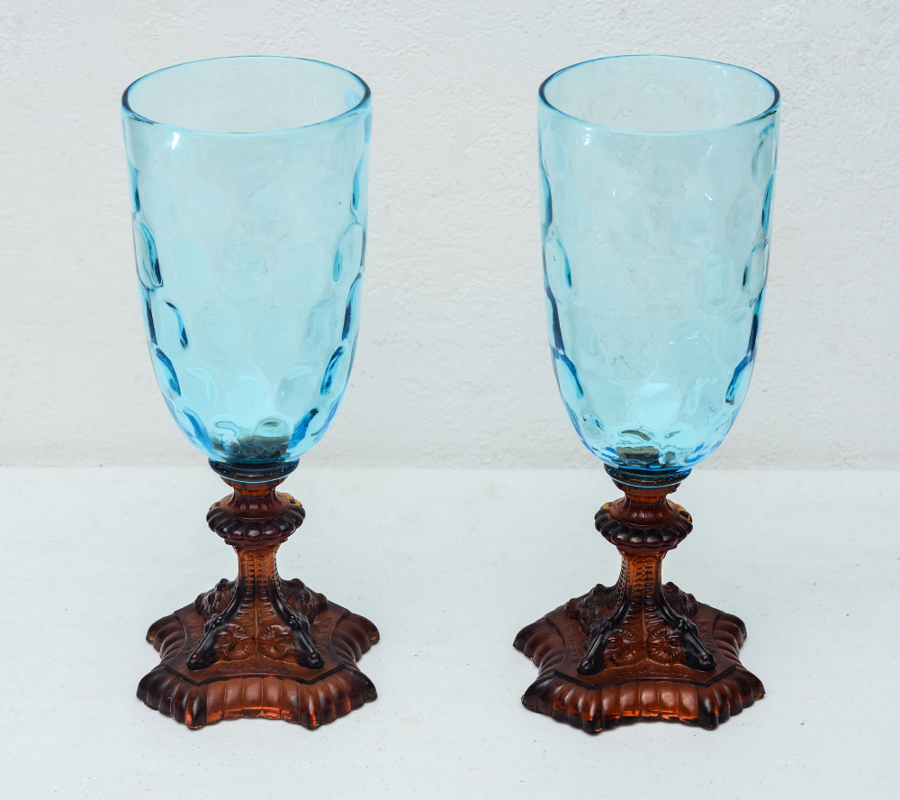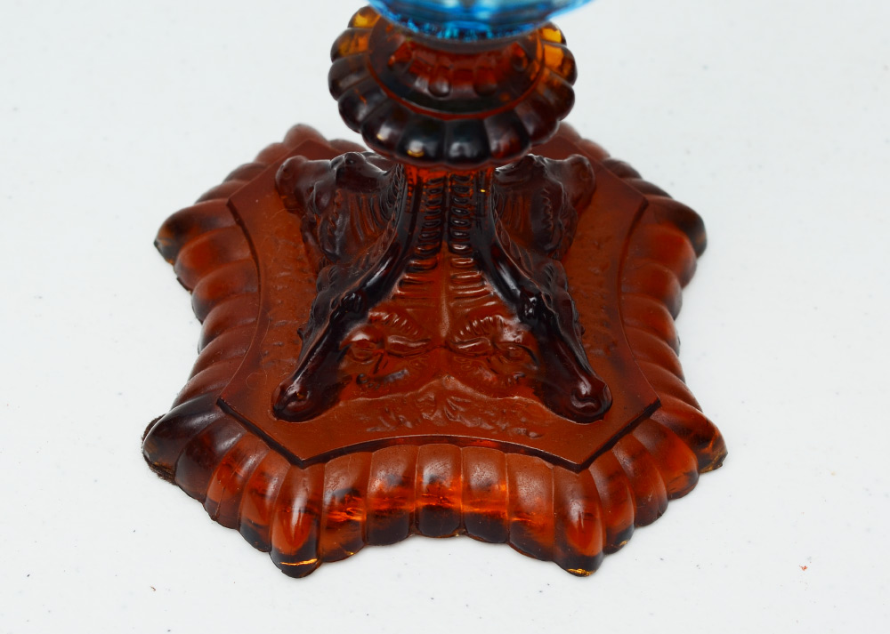 PAIR TWO COLOR GLASS VASES: Blue glass mounted on a pressed brown glass base with rams head masquerons. Approx. 11'' tall.