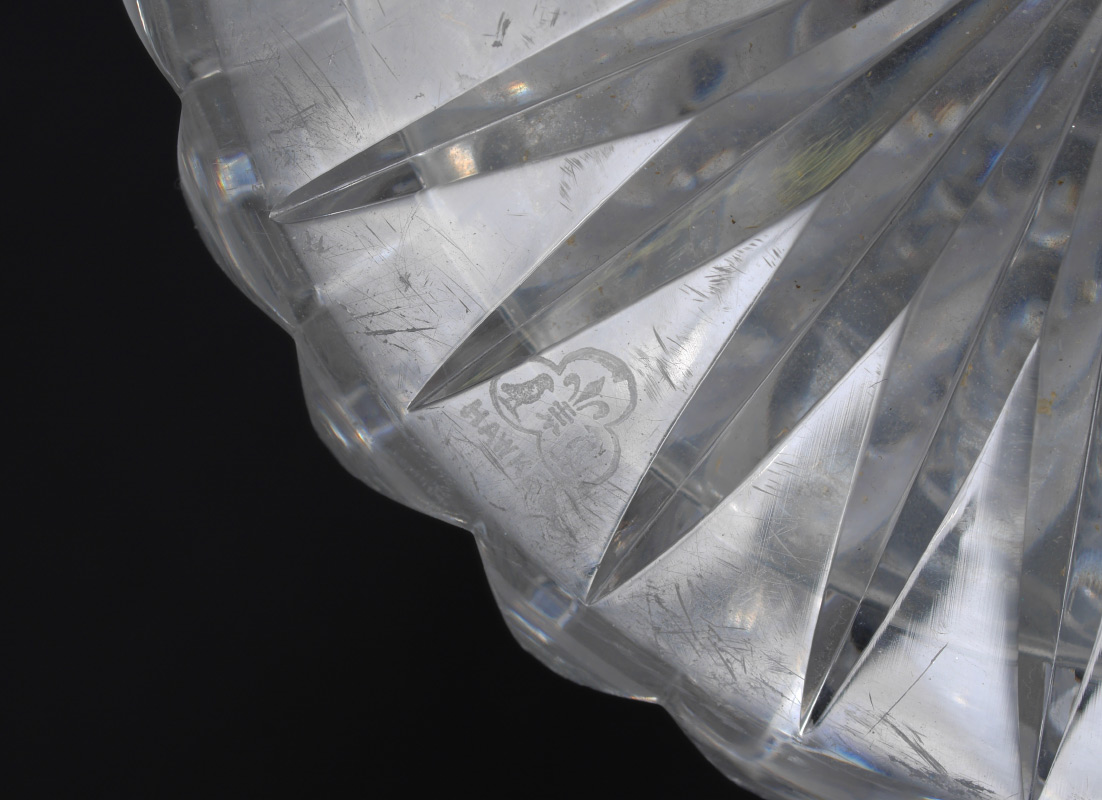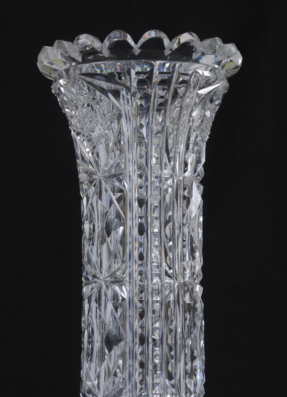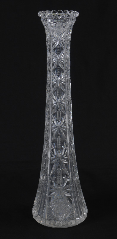 SIGNED HAWKES TALL CUT GLASS VASE: Flared rim with teeth, tapered body, signed on base with Hawkes trefoil mark. Overall marked 18.5'' tall x 5'' dia.