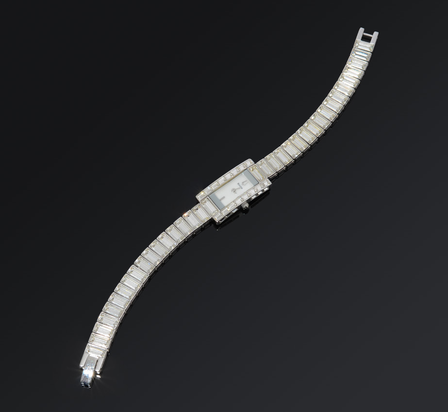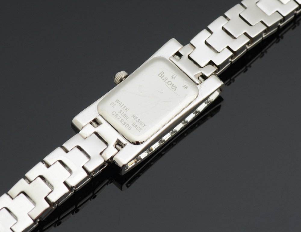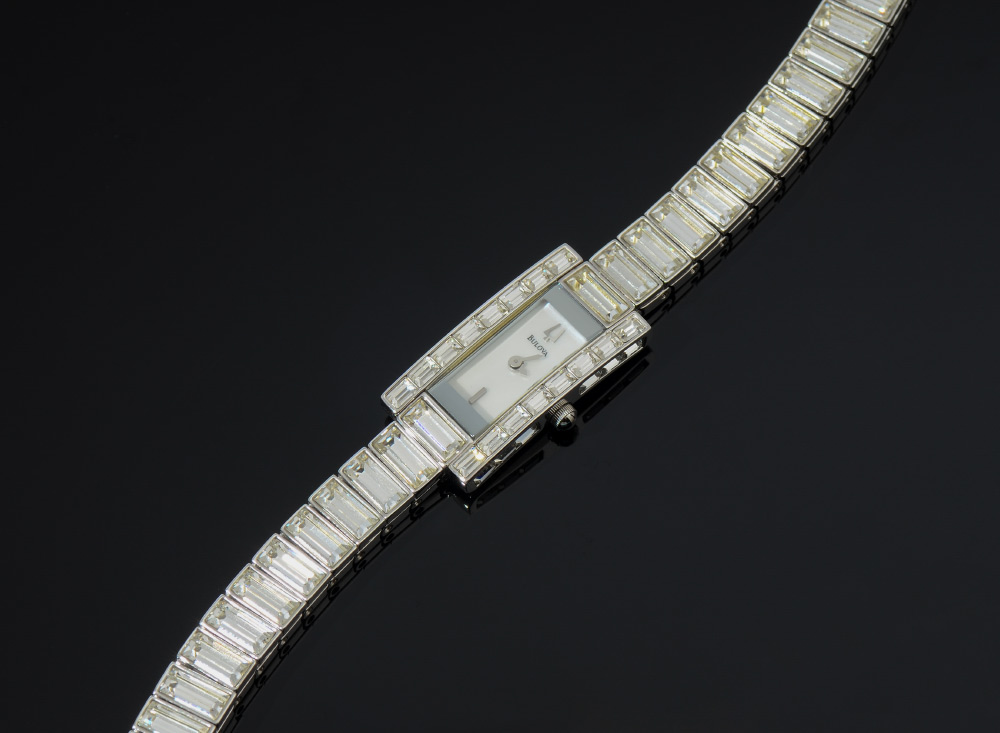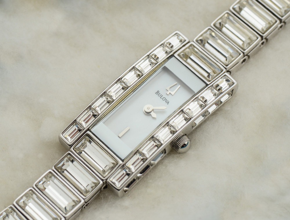 LADIES BULOVA CRYSTAL WATCH: Ca. 2006. The band and case are covered in emerald cut crystals. The white dial has a single marker at 6, the Bulova logo at 12. Model C876805. In working order. Length 7''.