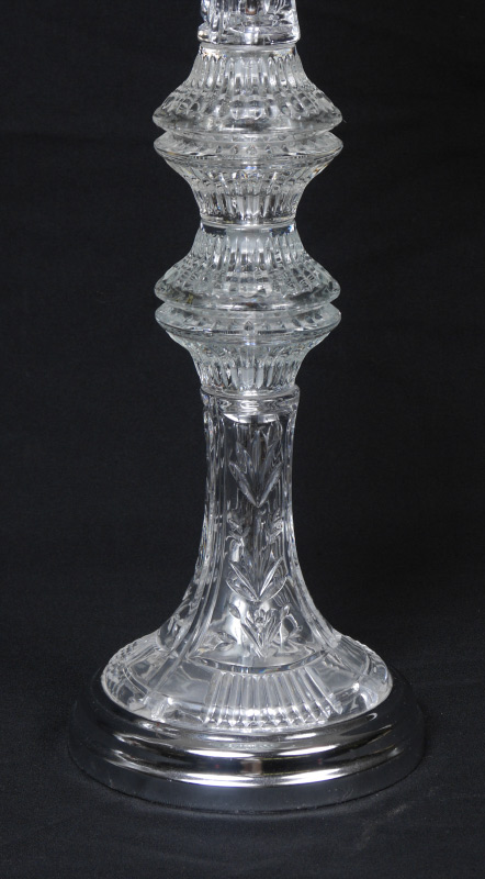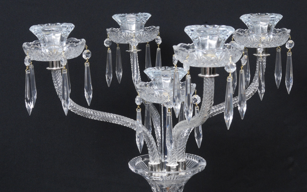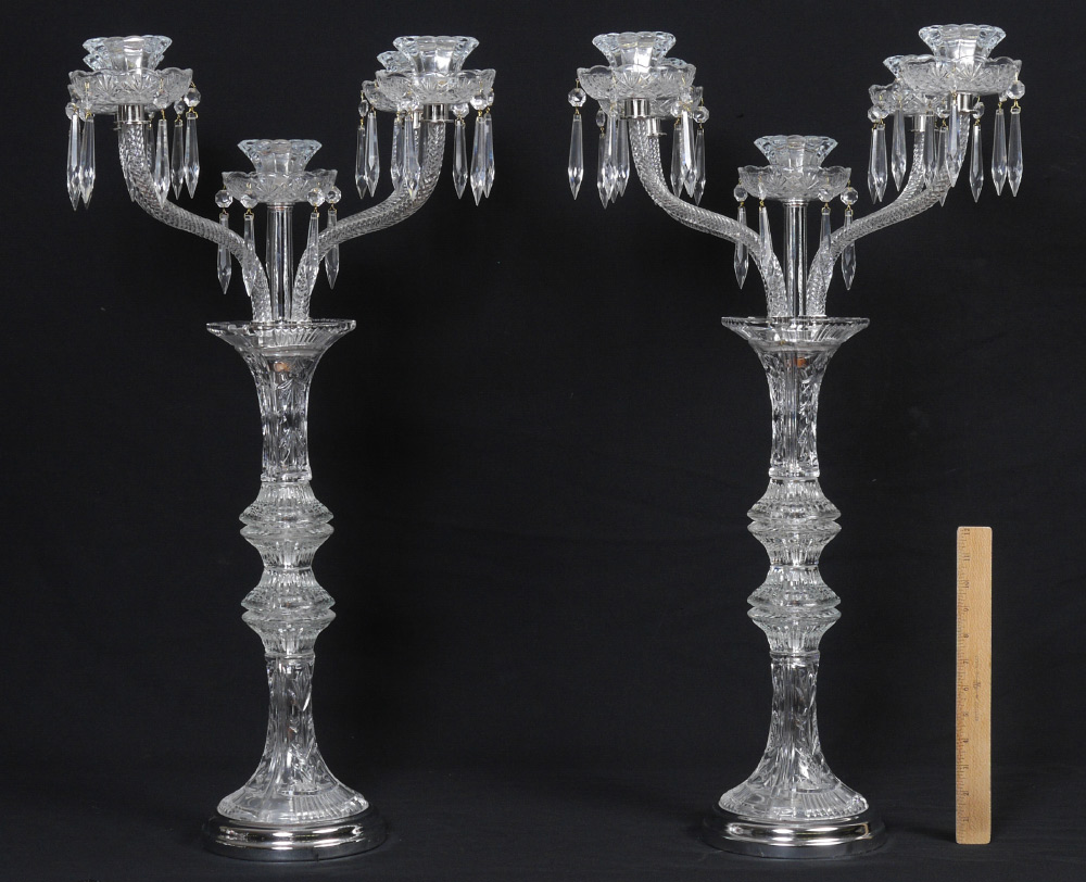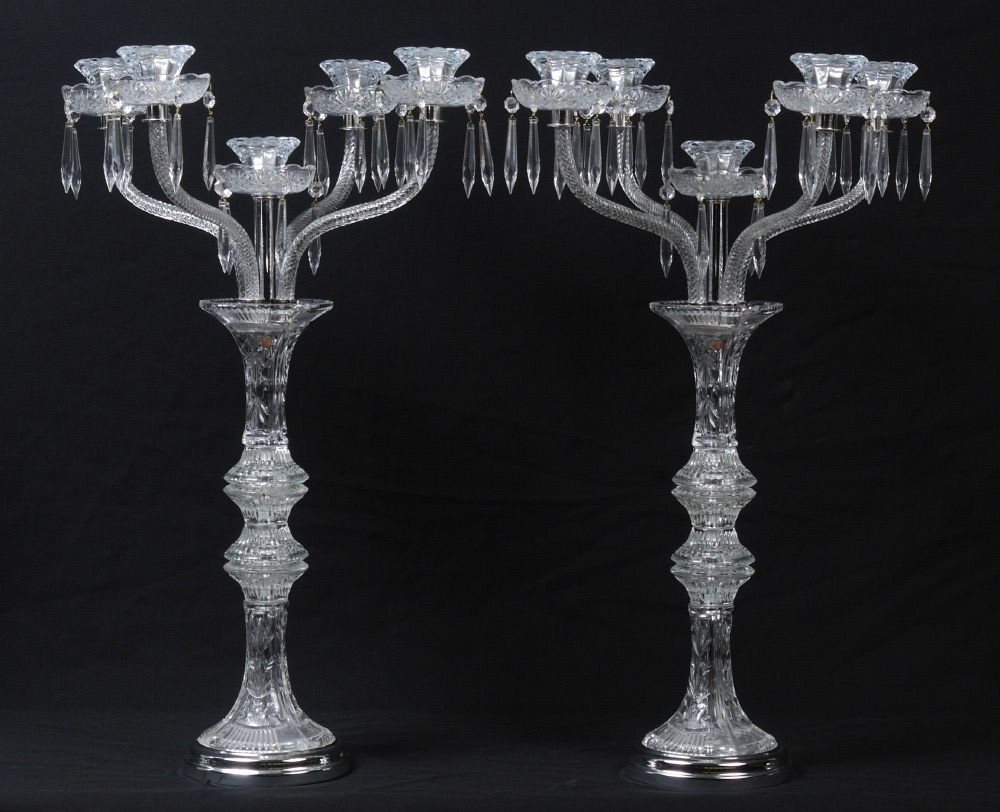 PAIR OF TABLE TOP CANDELABRA: Contemporary 5 light pressed glass with rope twist arms, chrome accents. Overall measures 30 1/4'' h. x 19 1/2''.