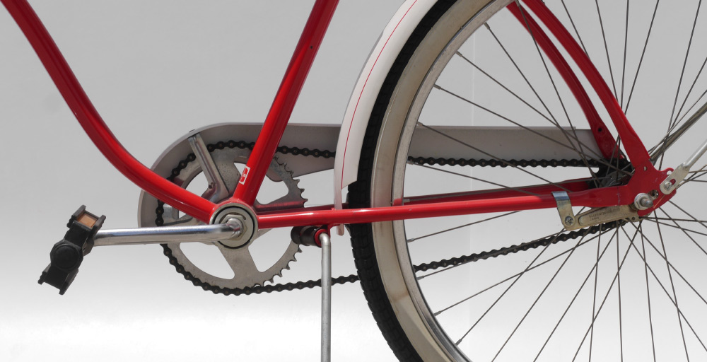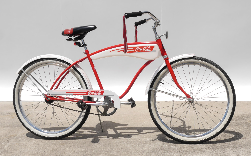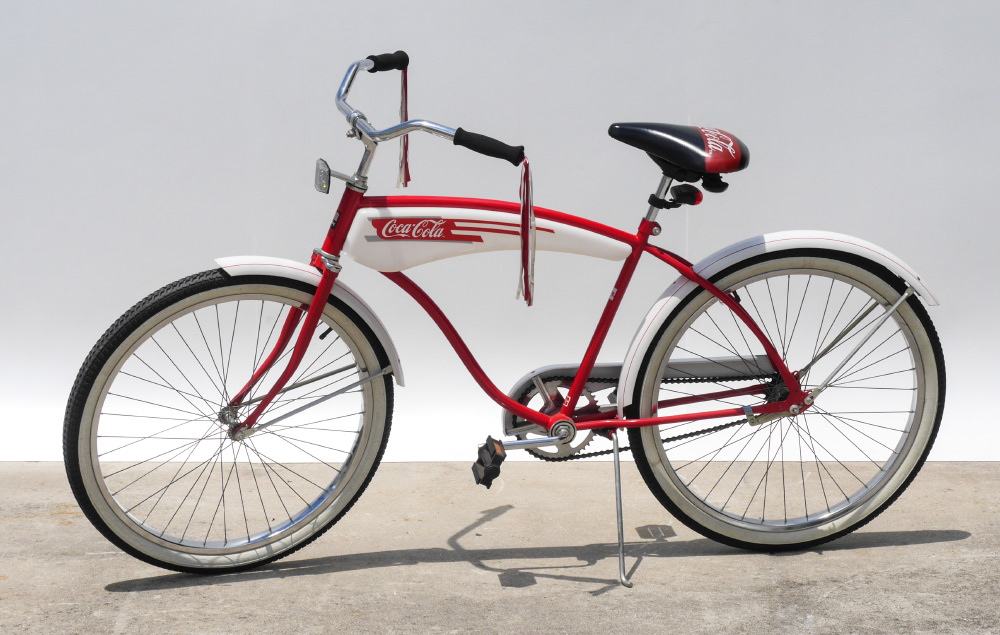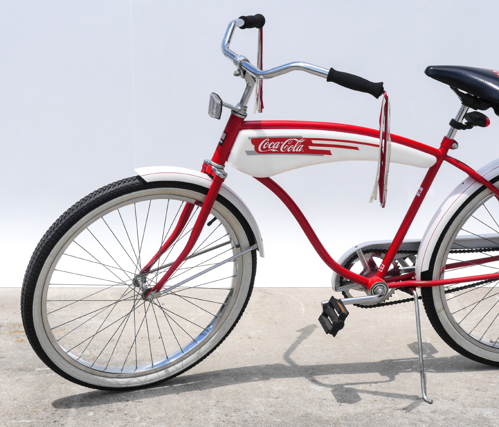 VINTAGE HUFFY COCA COLA THEME BICYCLE: Red and white with applied Coca-Cola decoration, used as promotional item, sold with an additional chain guard. Approx. 39 1/2'' h. x 69'' x 25 3/4''.