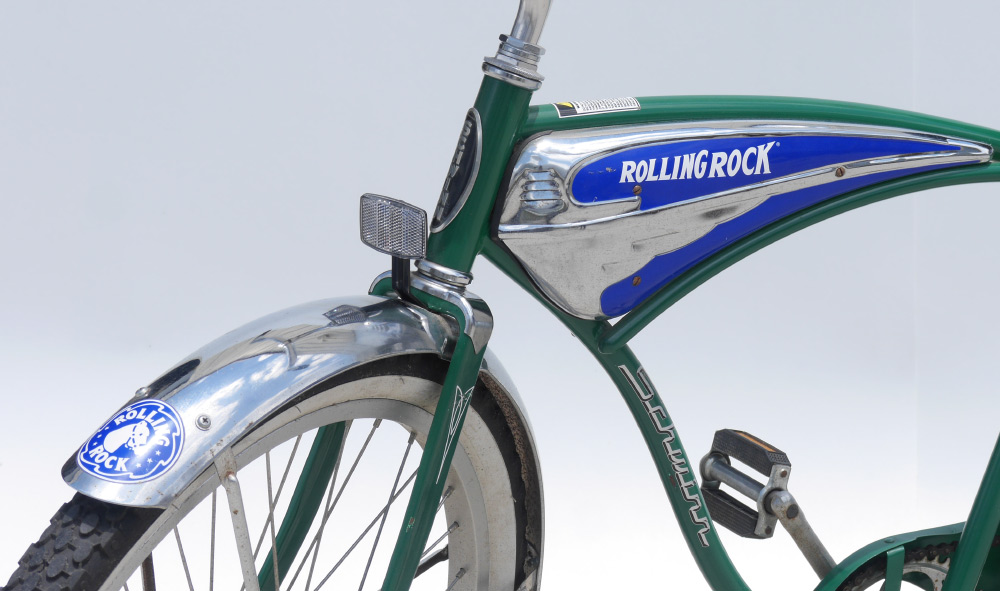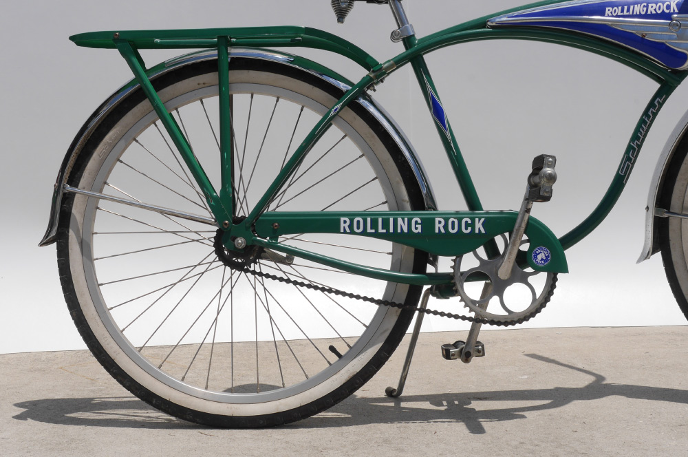 SCHWINN ROLLING ROCK PROMOTIONAL BICYCLE: Used as a promotional item in bars & nightclubs in the 1990's, green, white and chrome with rear rack. Overall measures approx. 40 1/2'' h. x 71'' x 26 3/4''.