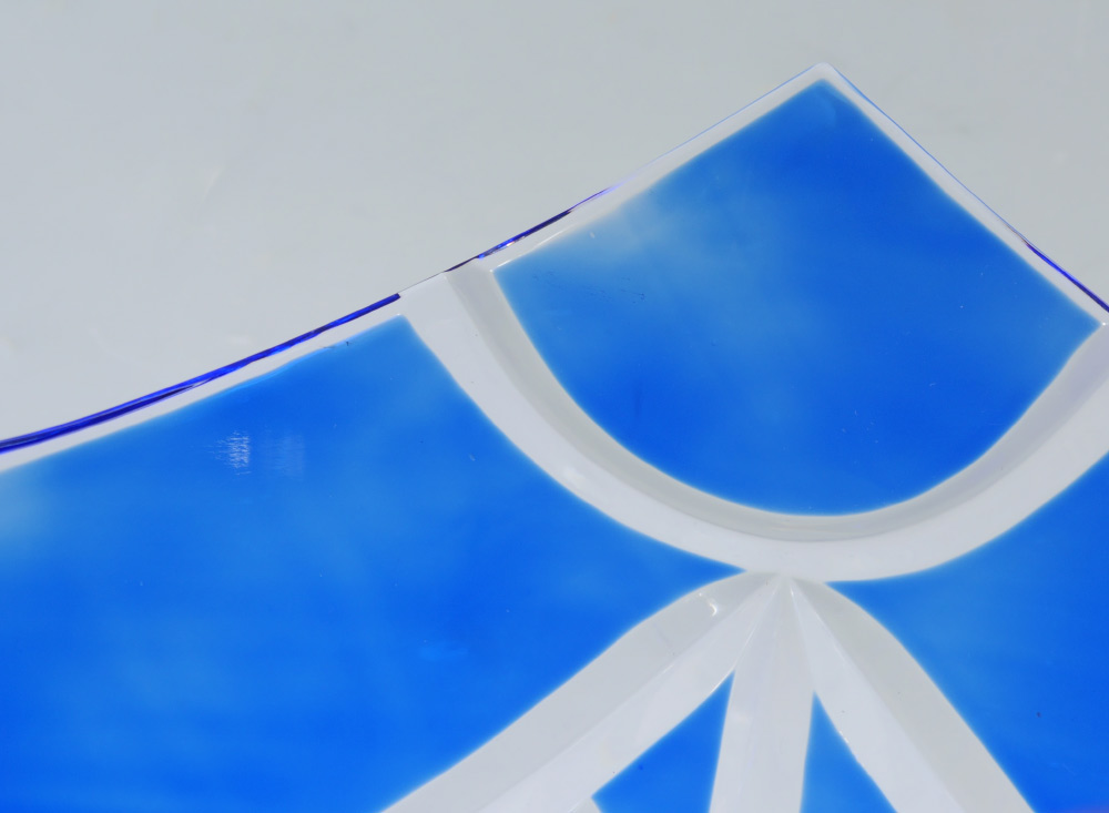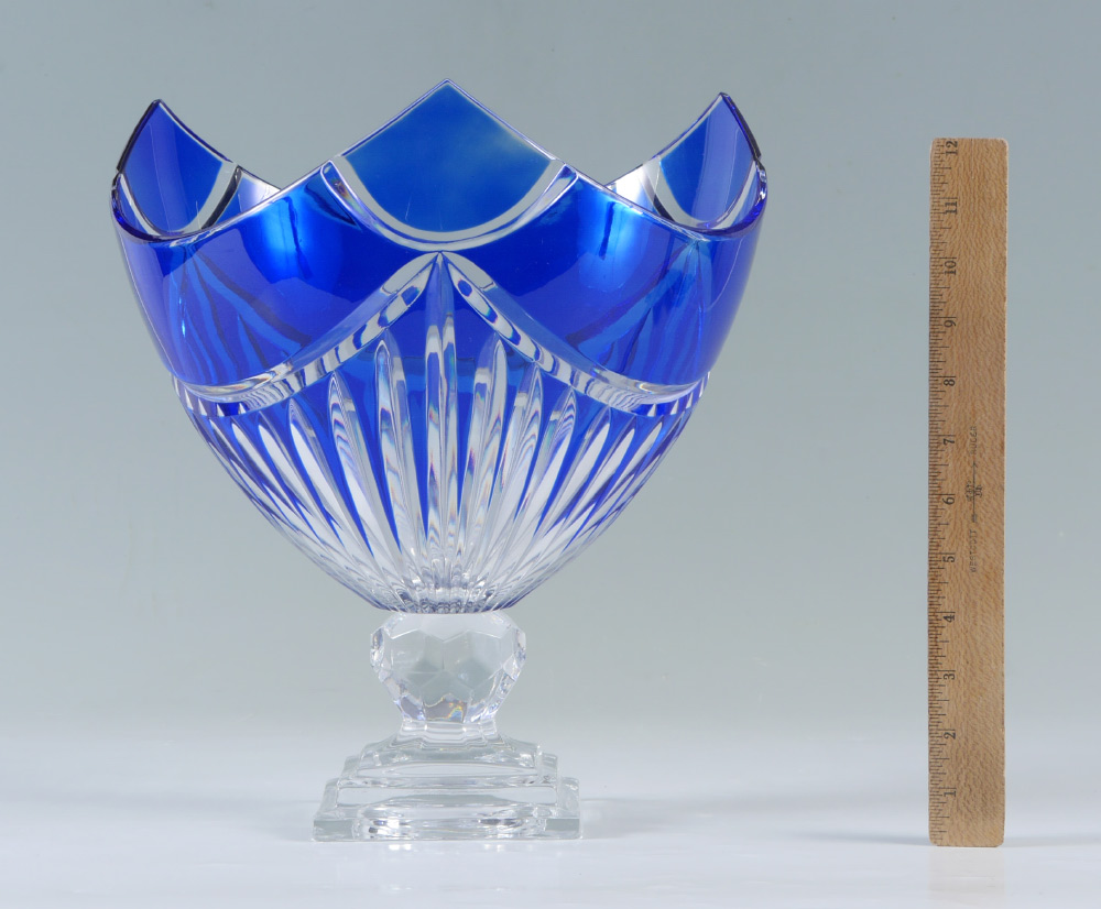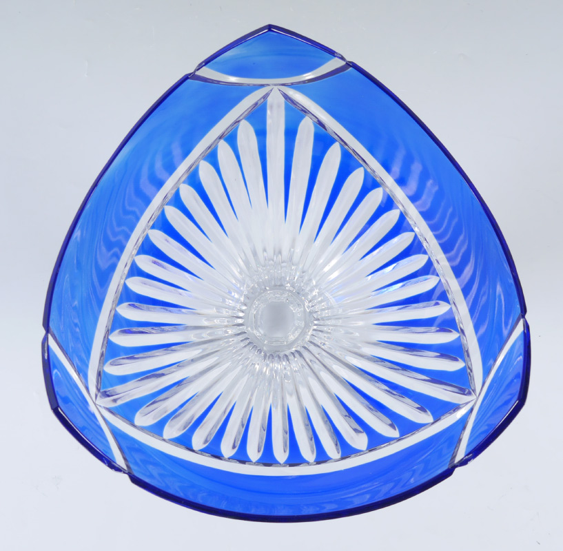 COBALT CUT TO CLEAR GLASS CENTER BOWL: Pedestal base, three sided bowl measures 13'' tall x 12'' dia.
