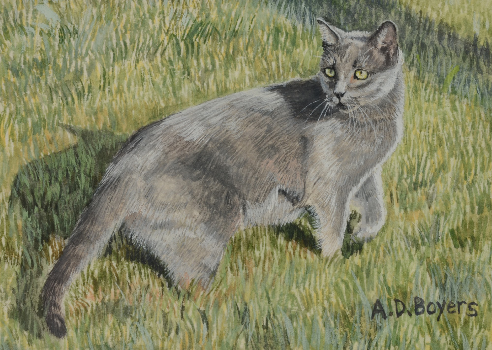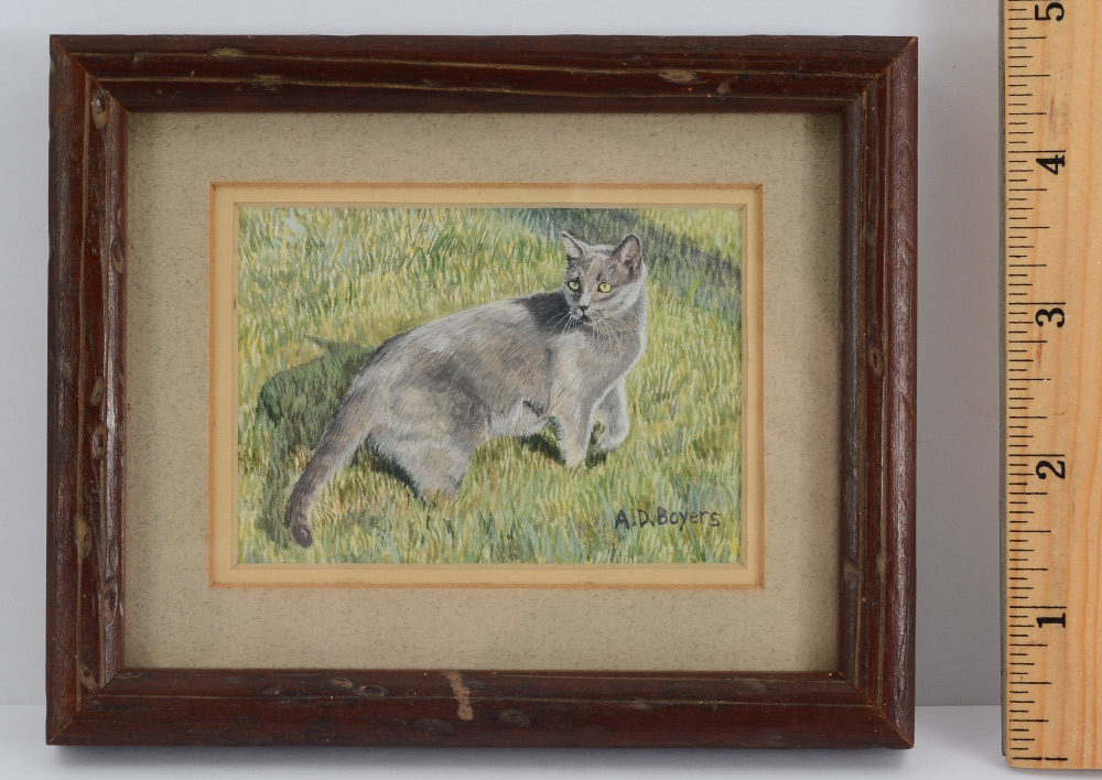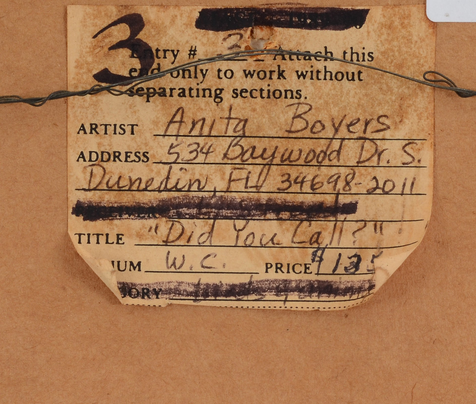 BOYERS, Anita, (American, 20th Century): ''Did You Call?'', Watercolor, sight size 2 1/2'' x 3 1/4'', signed lower right, framed 4 1/2'' x 5 3/4'', MASF exhibition label affixed verso dated 1988.
