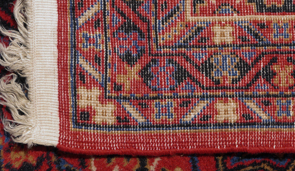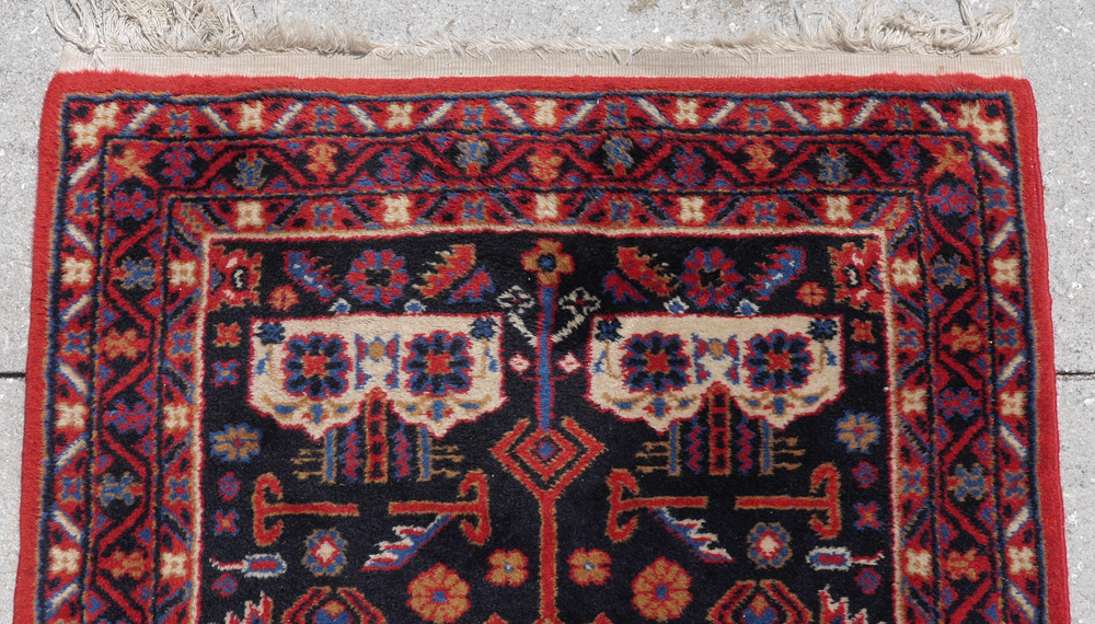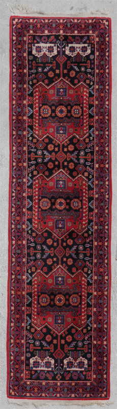 APPROX. 15-25 YR. OLD INDO-PERSIAN WOOL RUG, 2'7'' x 8'11'': This runner has three main medallions going down the center of the runner. At either end are two smaller white medallions placed side by side. The rest of the field is covered with flower heads and leaves. Condition is good although the fringes are worn.